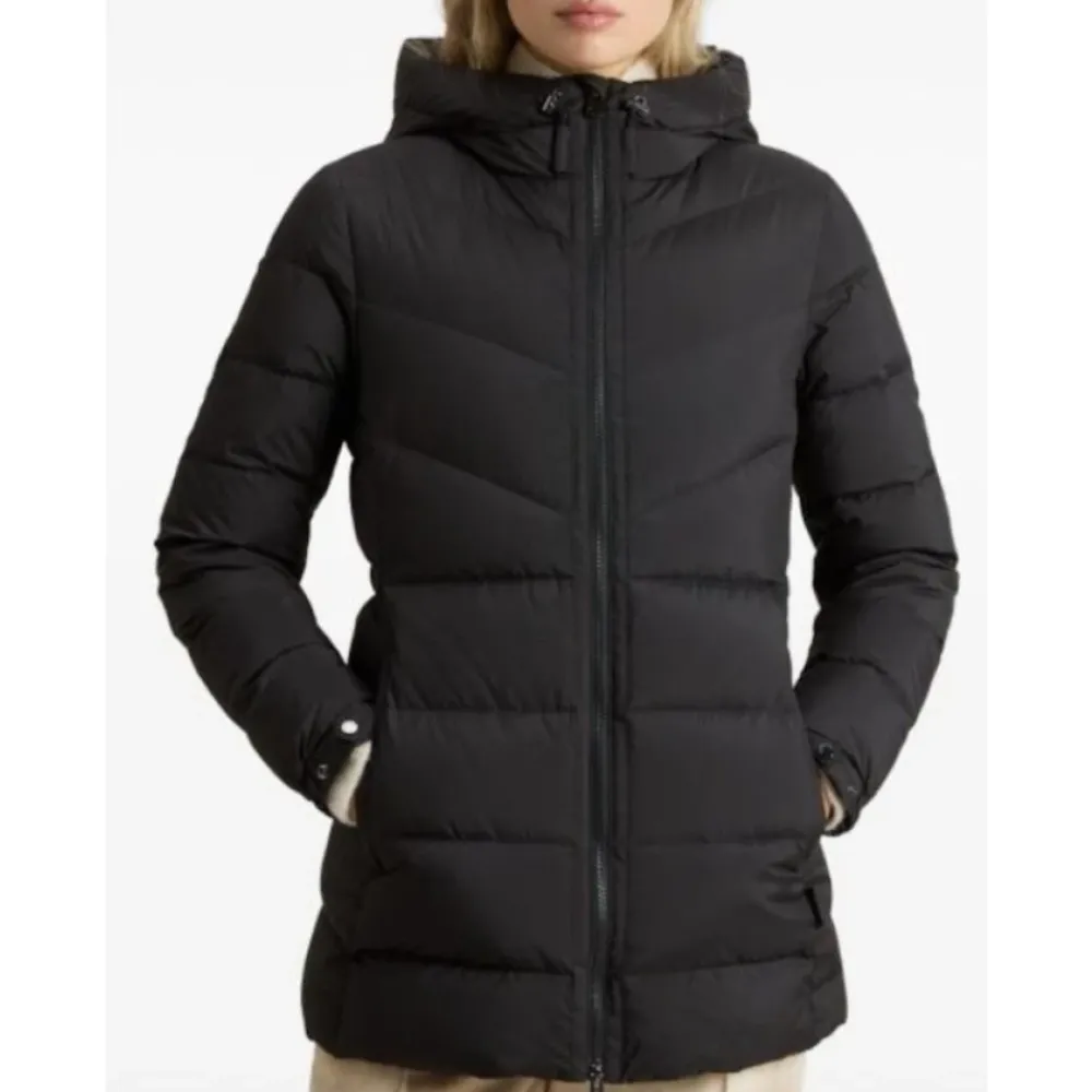 Blijf warm en stijlvol deze winter met deze zwarte donsjas van Woolrich. Met een doorgestikt ontwerp, aantrekkoord in de capuchon, ritssluiting, twee zijzakken en een logolabel op de achterkant van de capuchon, biedt deze jas een reguliere pasvorm voor een comfortabel gevoel.