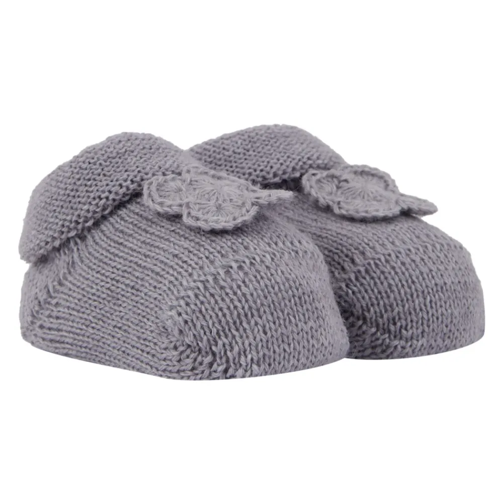 Zachte kindersokken gemaakt in Italië. Gemaakt van gebreide stof en versierd met een gehaakte bloem, deze zullen je kleintje een vleugje onmiskenbare originaliteit geven. De omhullende grijze tint is gemakkelijk te combineren met elke romper. Houdt de kleintjes warm, zelfs op de koudste dagen. Gallo: belichaamt kwaliteit sinds 1927.