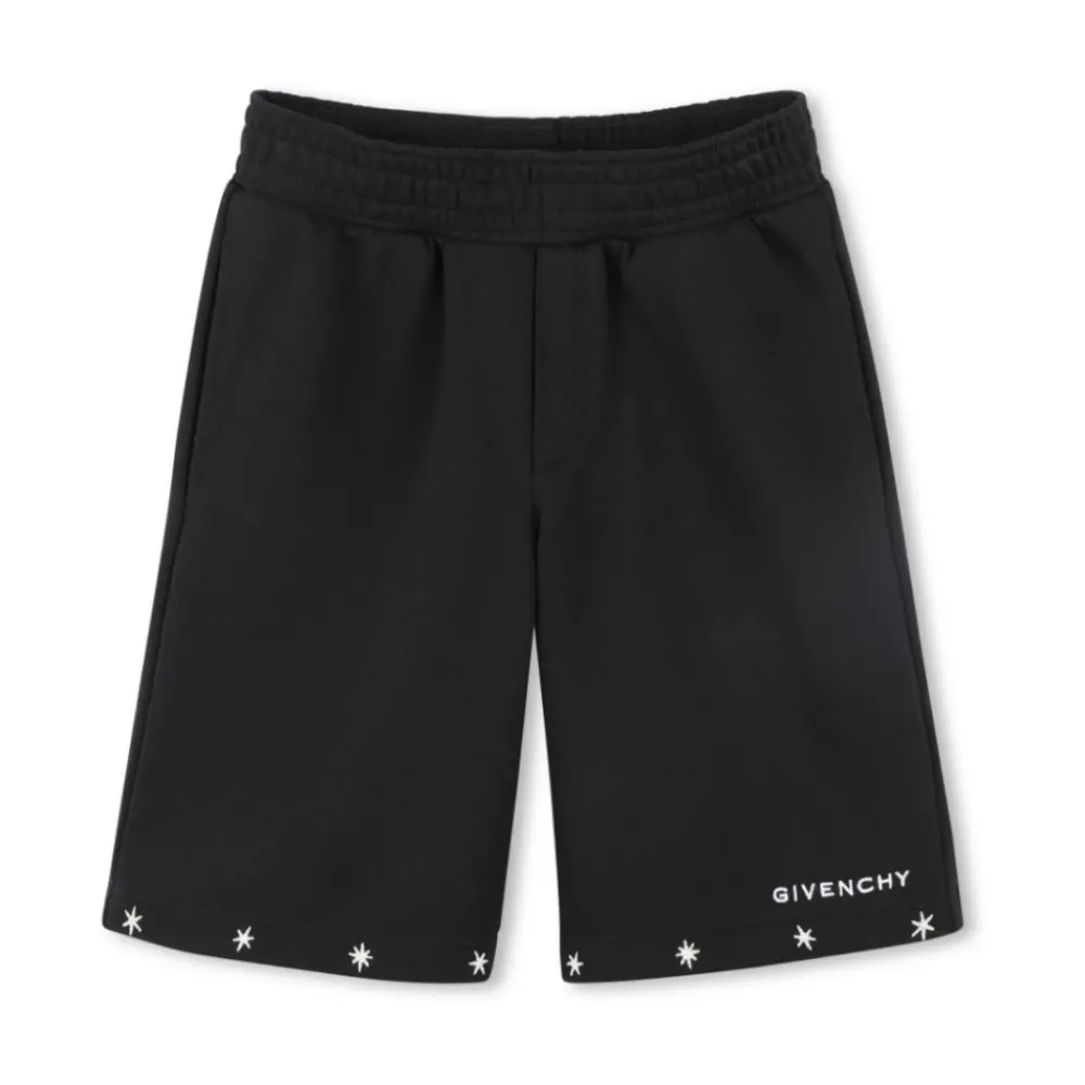 Upgrade de garderobe van je kind met deze stijlvolle zwarte Bermuda shorts van Givenchy, gemaakt van een premium mix van katoen en polyester. Perfect voor zomerse uitstapjes, ze combineren stijl en comfort, waardoor je kind opvalt met verfijning en flair. Belangrijkste kenmerken: Zwart | Katoen | Polyester | Elastische tailleband | Twee steekzakken aan de zijkant | Contrasterend logo | Sportieve stijl | Afmetingen en pasvorm: Regular fit | Samenstelling en onderhoud: Katoen | Polyester