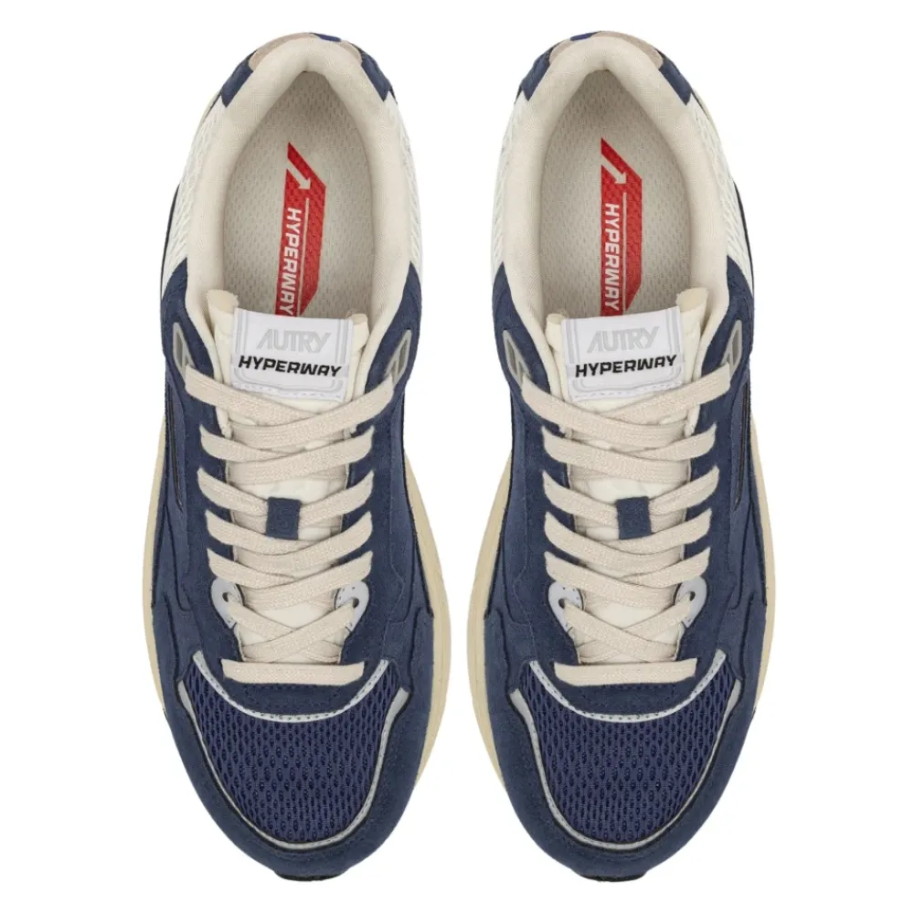 Upgrade je stijl met deze donkerblauwe Autry ‘Hyperway’ lage sneakers voor heren. Gemaakt van lichtgewicht en ademend mesh en suède, hebben deze sneakers ‘Action Cush’ technologie voor extra demping en optimaal comfort. Compleet met een nylon tong, logo patch, beige hielkap met blauw logo, vetersluiting en gewatteerde kraag in mesh katoenen terry voering. De PI zool en 3,5 cm hoge zool zorgen voor duurzaamheid en stijl. Stofdetails: Bovenwerk – 75% Suède, 20% Mesh, 5% Leer; Voering – 70% Katoen Terry, 15% Mesh, 10% Nylon, 5% Leer; Zool – 75% Phylon, 15% Rubber, 10% TPR.