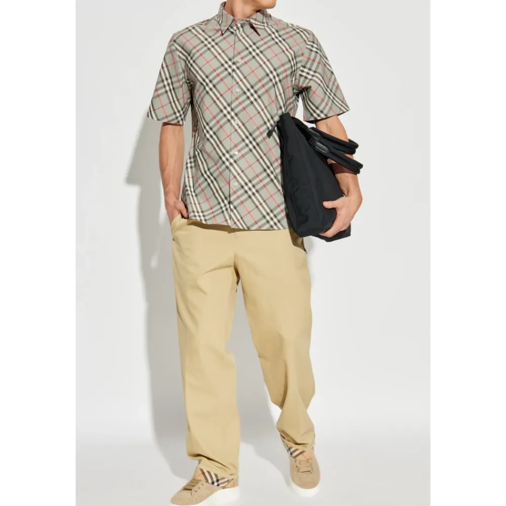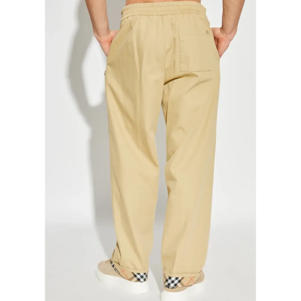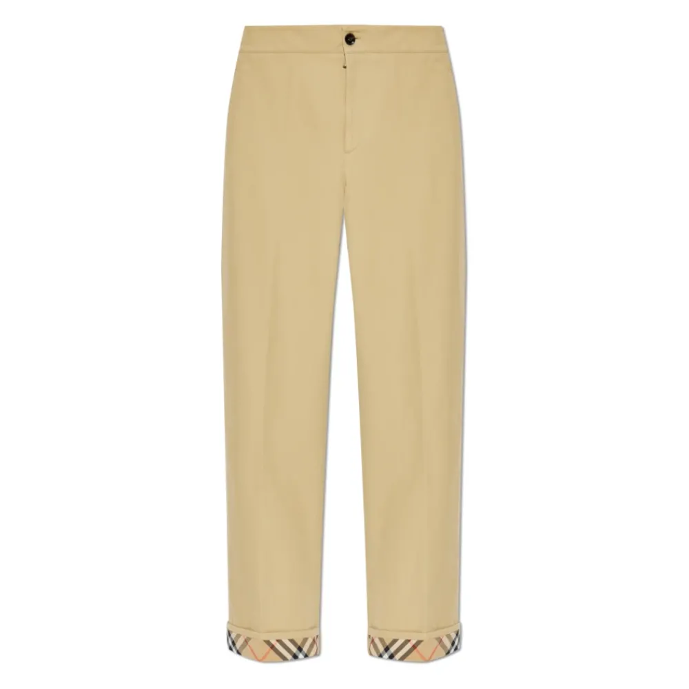 De Burberry Gabardine Broek is een relaxte broek met rechte pijpen, afgewerkt met kenmerkende omslagmanchetten met Burberry Check-motief. Ontworpen voor verfijnde dagelijkse kleding en combineert comfort met subtiele, herkenbare details. Belangrijkste kenmerken: Hamper beige | Katoen | Ademende stof | Schuine steekzakken | Achterzak | Elastische taille aan de achterkant | Knoop- en ritssluiting | Rechte pijp | Omslagmanchetten met Burberry Check-bies | Discreet geborduurd logo | Gladde, licht matte afwerking | Afmetingen & pasvorm: Binnenbeenlengte: 80 cm (maat IT 48) | Relaxte pasvorm | Rechte pijp | Samenstelling & onderhoud: 100% katoen | Bies: 100% katoen | Zakvoering: 100% katoen | Knopen: Buffelhoorn | Handwas
