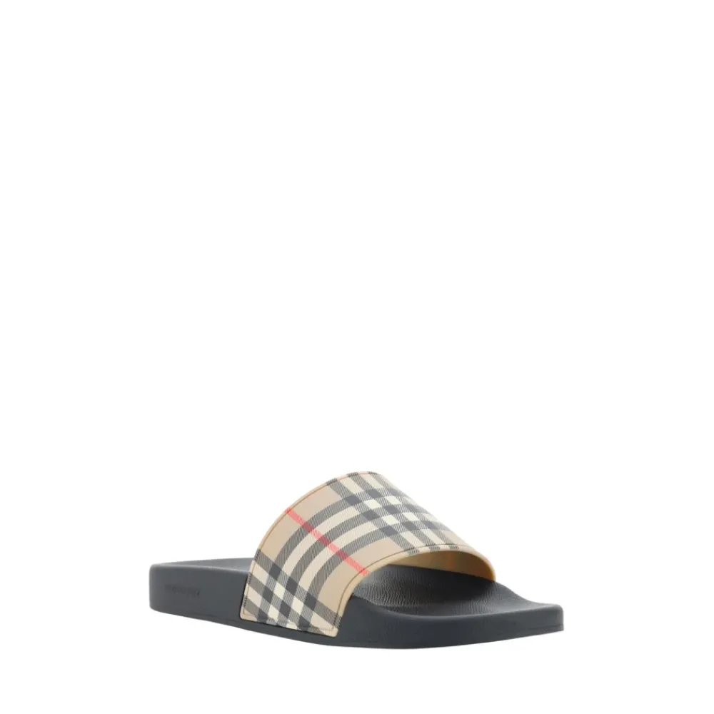Verrijk je zomerse stijl met de Check Pattern Slides van Burberry, met het iconische Archivio check-patroon op de brede band aan de voorkant. Deze in Italië vervaardigde sliders geven een luxe touch aan casual outfits. Belangrijkste kenmerken: Bruin | Rubber | Polyurethaan | Brede band aan de voorkant | Ronde neus | Inlegzool met logo-reliëf | Afmetingen en pasvorm: Platte zool | Samenstelling en onderhoud: 100% Rubber | 100% Polyurethaan