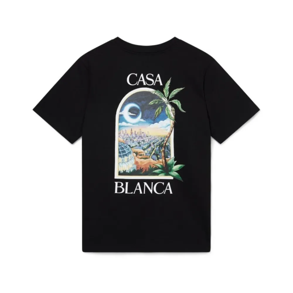 Casablanca La Nights T-shirt met een opvallend gedrukt motief geïnspireerd door een nachtelijk raam in Los Angeles. Een casual, makkelijk te dragen T-shirt, geschikt voor alledaagse looks en laagjes. Belangrijkste kenmerken: Zwart | Katoen | Ronde hals | Korte mouwen | Gedrukt motief aan de voorkant (raam op het nachtlandschap van Los Angeles) | Bedrukte katoenen stof | Afmetingen & pasvorm: De maatvoering is bijgewerkt vanaf de lente-zomer 2025. | Kies je gebruikelijke maat; als je al dezelfde pasvorm hebt, overweeg dan een maat kleiner. | Samenstelling & onderhoud: 100% katoen | Fijne machinewas.