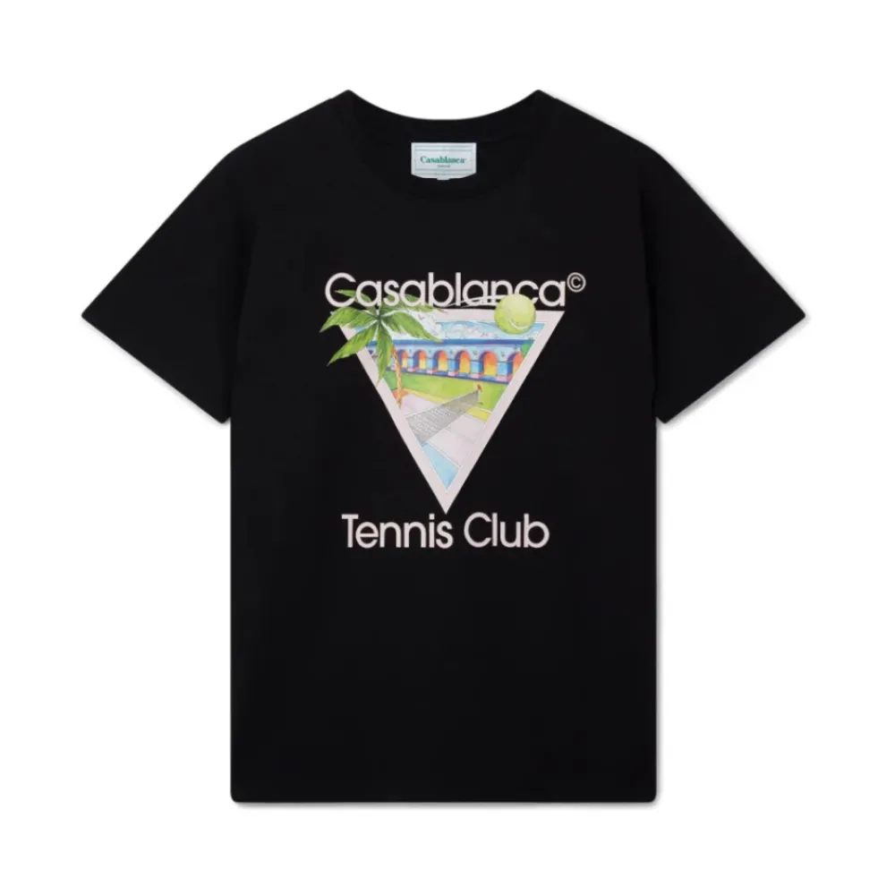 Het Tennis Club Icon T-shirt heeft een bedrukt motief dat het iconische kunstwerk van het huis laat zien, herinterpreteerd voor het seizoen door elementen van tennis, natuur en architectuur op te nemen. Gemaakt van 100% biologisch katoen, met een klassieke ronde hals en een Casablanca merklabel. Kleur: zwart. Fijne machinewas. Gemaakt in Portugal. Uniseks pasvorm, neem uw gebruikelijke maat. Model is 187 cm/6’1 en draagt maat M.