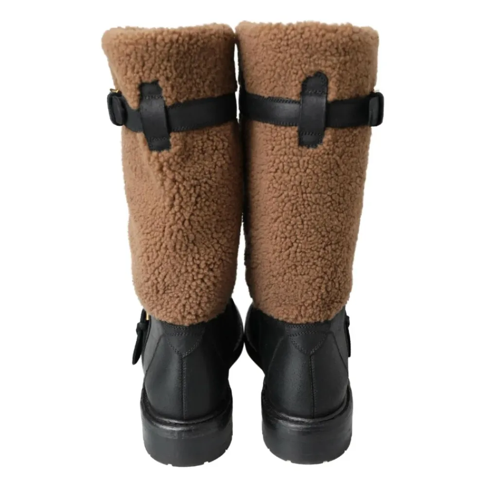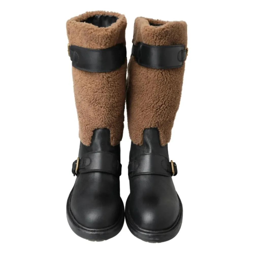 Upgrade je winterstijl met deze Dolce & Gabbana zwarte leren en bruine shearling laarzen voor heren. Gemaakt in Italië met het beste vakmanschap, hebben deze laarzen een stijlvolle zwart en bruin kleurencombinatie. Het bovenwerk is gemaakt van 53% leer en 47% shearling voor een luxueus gevoel. De rubberen zool en elegante gespsluitingen maken deze laarzen tot een verfijnde keuze. Compleet met logo-details zijn deze exclusieve laarzen een must-have voor elke garderobe.