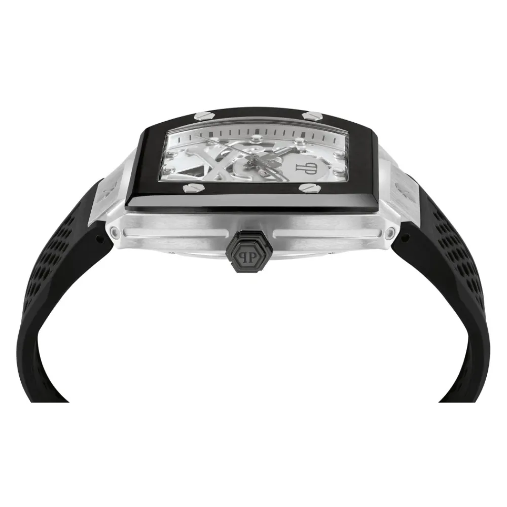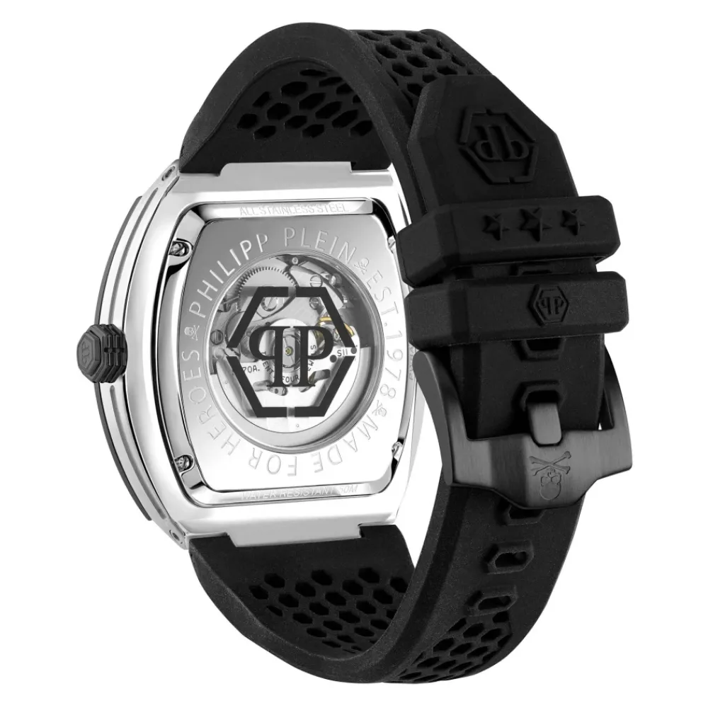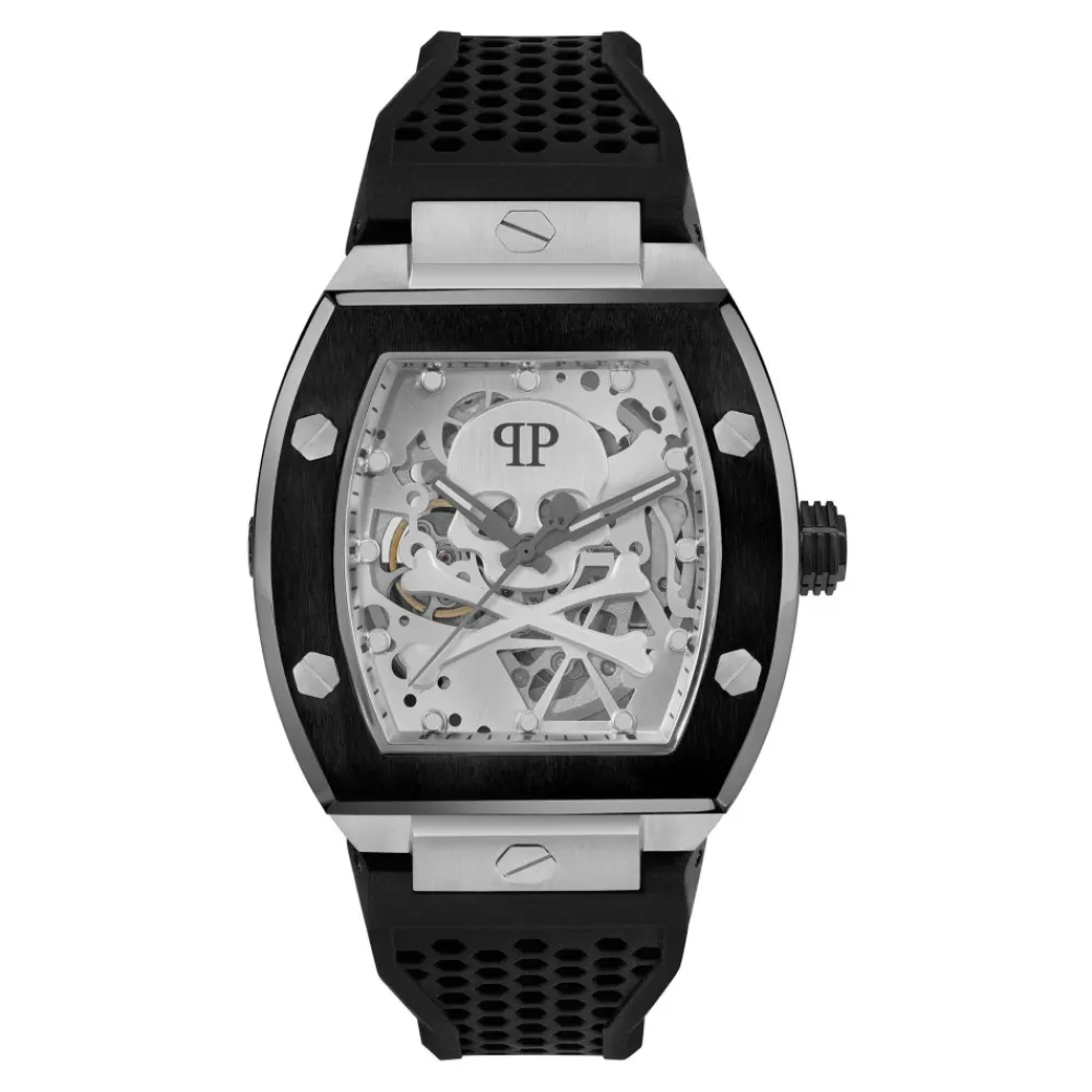 Philipp Plein presenteert The $keleton Watch, een opvallend uurwerk met een zilveren en zwarte esthetiek en kristallen versieringen. Belangrijkste kenmerken: Zilver | Zwart | Roestvrij staal | Waterbestendig tot 5 ATM | Automatisch uurwerk | Met kristallen versierde wijzerplaat en lunette | Zwarte siliconen band |