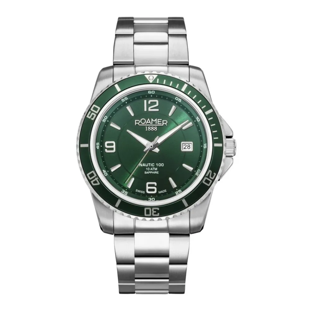 Het Roamer Analoog Horloge combineert een groene wijzerplaat met een roestvrijstalen constructie en een betrouwbaar quartz uurwerk. Het horloge biedt 10 bar waterbestendigheid, een datumfunctie en een vouwsluiting voor dagelijks gebruik. Belangrijkste kenmerken: Groen | Zilver | Roestvrij staal | Waterbestendig tot 10 bar | Saffierglas | Quartz uurwerk | Datumfunctie | Vouwsluiting | Analoge weergave | Afmetingen & pasvorm: Diameter kast (zonder kroon): 43 mm | Hoogte kast: 12 mm | Samenstelling & verzorging: Roestvrij staal | Saffierglas
