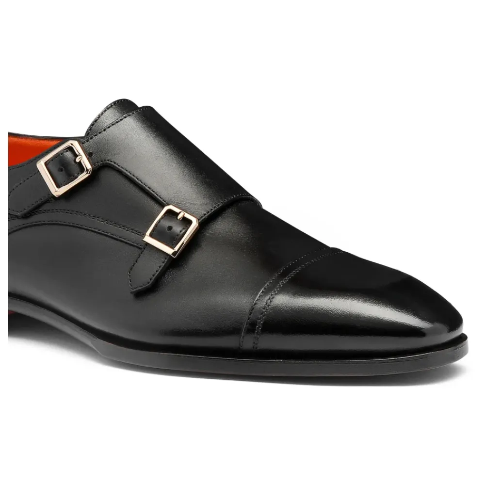 Een verfijnde, fascinerende stijl en de iconische silhouet van de dubbele monniksband. Deze herenschoen van hoogwaardig leer voegt een speciale touch toe aan zelfs zeer formele looks. De stiksels op de neus van de schoen en de zool in klassiek Santoni-oranje maken het ontwerp compleet.