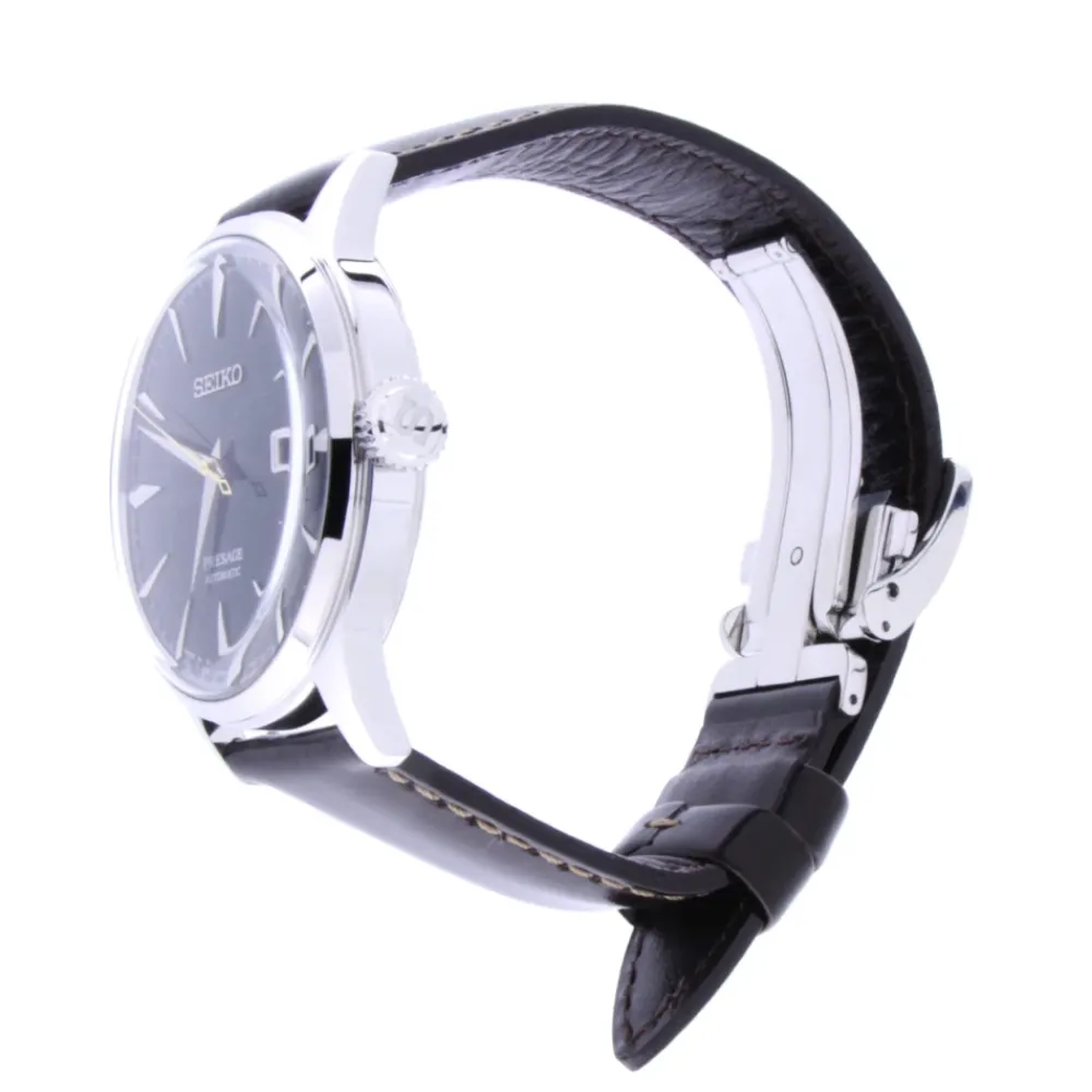 De Seiko Presage Cocktail Time is een automatisch dress watch die zich onderscheidt door zijn levendige groene wijzerplaat en verfijnde details. Hij combineert klassieke styling met een betrouwbaar automatisch uurwerk voor dagelijks gebruik en formele gelegenheden. Belangrijkste kenmerken: Groen | Verde e Acciaio | Roestvrij staal | Waterbestendigheid 5 ATM | Geschatte gangreserve van 41 uur | Automatisch uurwerk (kaliber 4R35) met handmatige opwinding | Datumaanduiding | Déployante sluiting (drievoudig met drukknopontgrendeling) | Transparante geschroefde achterkant | Groene geperste sunray wijzerplaat | Box-vormig Hardlex kristal | Bruine leren band | Appliqué stalen uurindexen | Afmetingen & pasvorm: Diameter kast: 40,5 mm | Dikte kast: 11,8 mm | Lug-to-lug: 47,5 mm | Lugbreedte: 20 mm | Samenstelling & verzorging: Kast: Roestvrij staal | Kristal: Hardlex | Band: Leer (bruin kalfsleer) | Sluiting: Déployante (roestvrij staal) | Veeg de kast en het kristal schoon met een zachte doek. Houd de leren band droog en verzorg het leer indien nodig. Vermijd blootstelling van het horloge aan sterke magneten en overschrijd de aangegeven waterbestendigheid niet. Laat het automatische uurwerk elke 3–5 jaar onderhouden.