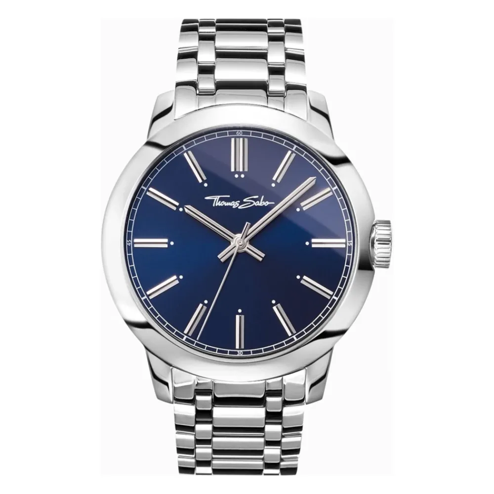 Ontdek het THOMAS SABO herenhorloge met een roestvrijstalen kast en armband in zilver en blauw. Met een diameter van 46,00 mm, een kasthoogte van 12,10 mm en een blauwe zonnestraal wijzerplaat. Waterbestendig tot 10 ATM, dit horloge bevat minuut-, seconde- en uurfuncties. Aangedreven door een betrouwbare MIYOTA 2036 uurwerk. Artikelnummer: WA0310-201-209.