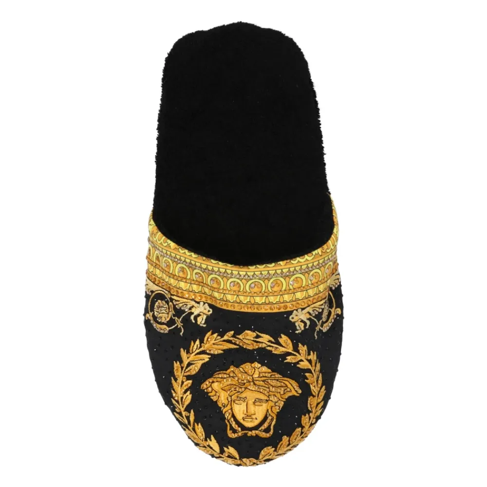 Zwarte slippers van Versace Home. Gemaakt van zacht terrycloth katoen, dit paar toont glinsterende applicaties, het kenmerkende Barocco-print en Medusa-borduursel van het merk.