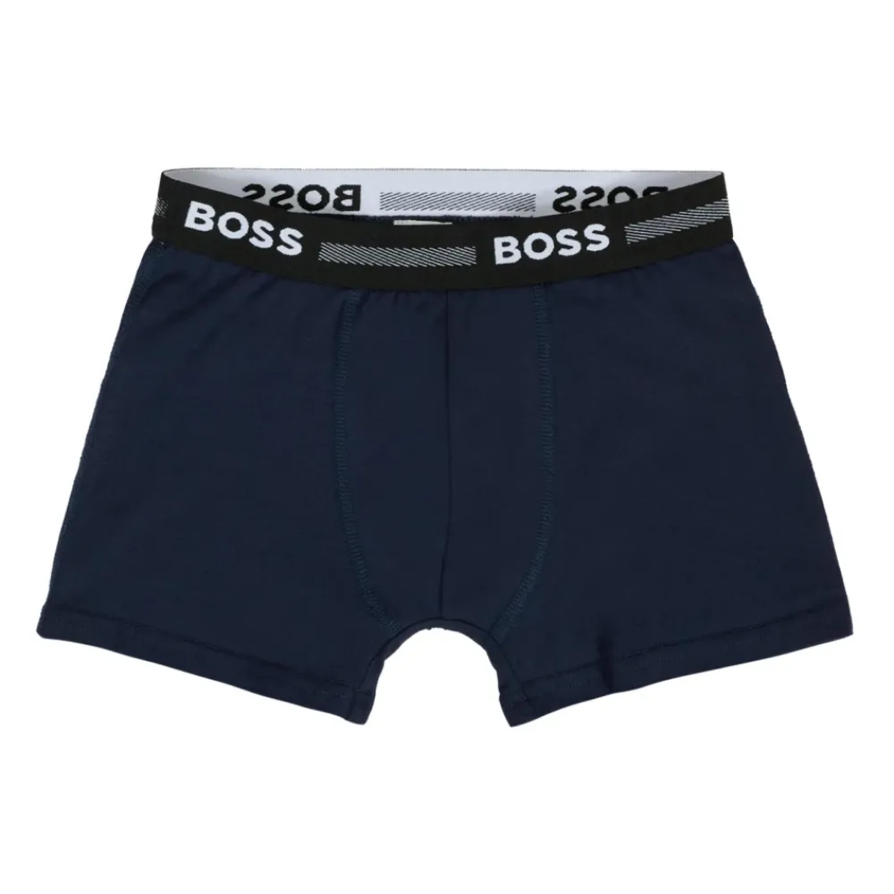 Hugo Kids Blauwe Boxershort Set – Twee pack blauwe boxershorts in een stretch katoenmix met merk elastische tailleband. Gemaakt van 95% katoen en 5% elastaan. Machinewas op 40°C.