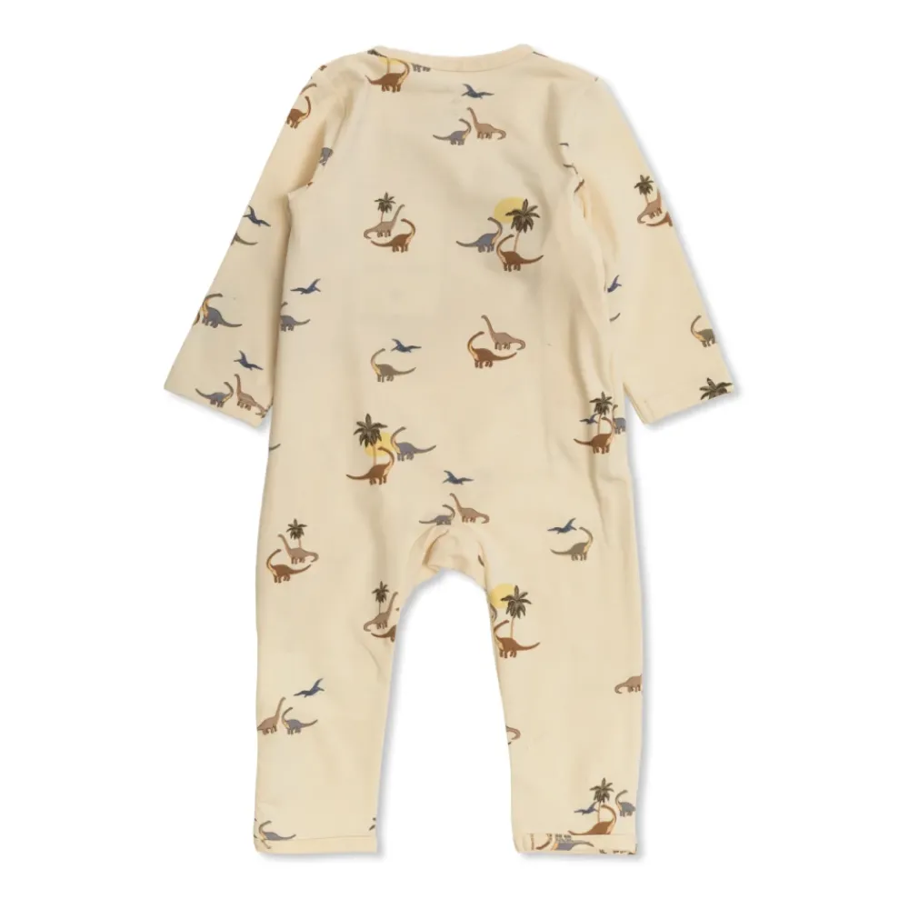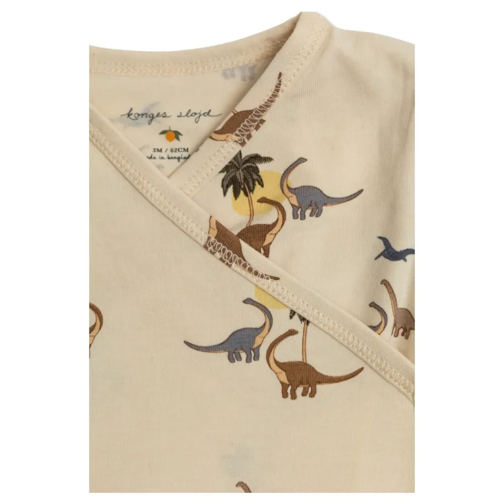Konges Sløjd Basic Newborn Body is een zachte bodysuit met lange mouwen die een subtiele prehistorische print combineert met een gemakkelijke overslagsluiting voor snel aankleden. De stretchstof en volledige bedekking maken het geschikt voor dagelijks gebruik en comfortabele laagjes. Belangrijkste kenmerken: Beige | Crème | katoen | Zacht handgevoel | Lichte stretch voor bewegingsvrijheid | Thermisch comfort | Overslag-/envelopsluiting voor gemakkelijk aankleden | Drukknoopsluitingen langs de zijkanten en het kruis | Lange mouwen en pijpen | Herhalende print van dinosaurussen, palmbomen en prehistorische vogels | Overslag-/envelophalslijn | Samenstelling & verzorging: 95% katoen, 5% elastaan | Machinewas 30°C. Strijken indien nodig.