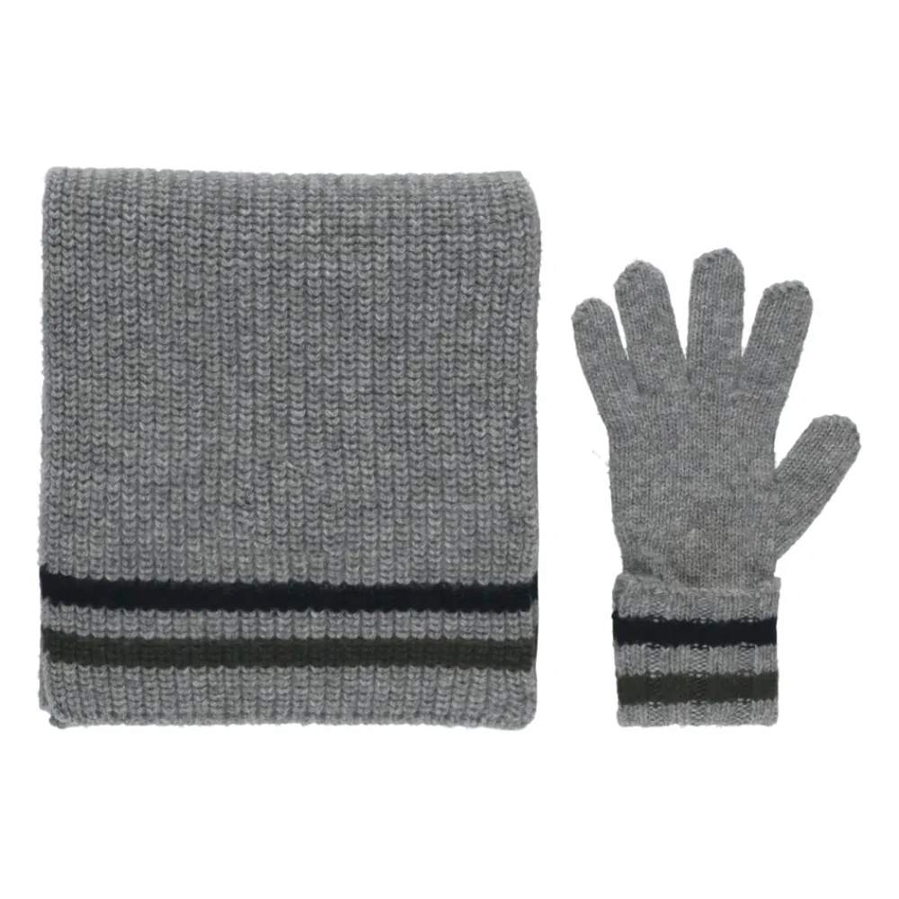 Blijf warm in stijl met deze grijze Moncler Enfant wollen sjaal en handschoenenset voor jongens. De sjaal heeft een contrasterende kleur logo-patch, terwijl de handschoenen ook een bijpassende logo-patch hebben. Perfect om je kleintje gezellig en modieus te houden.