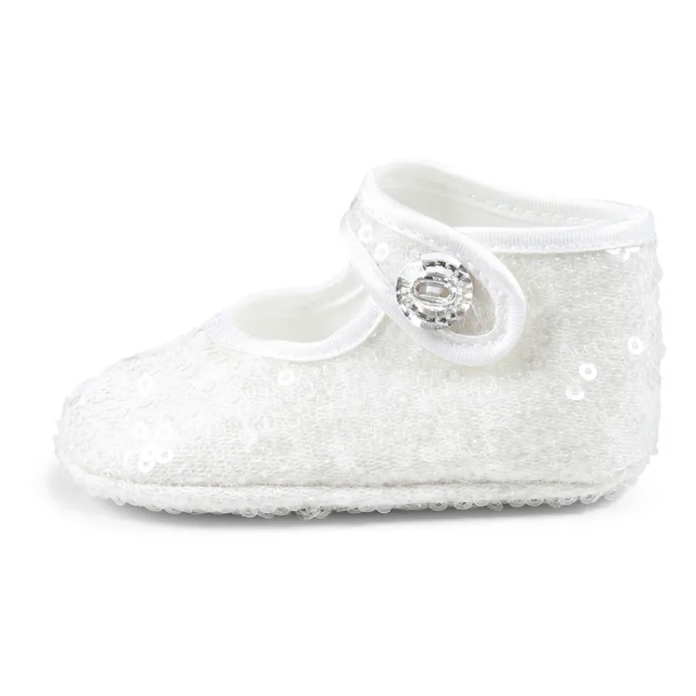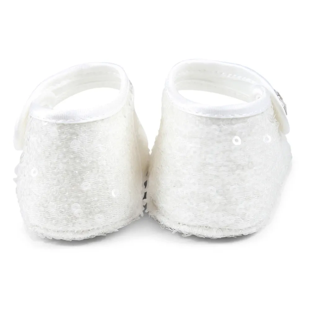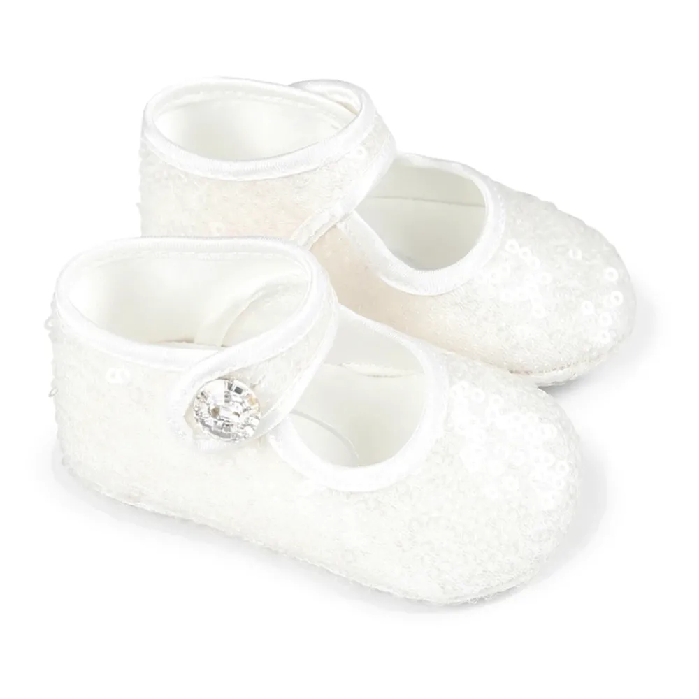 Verrijk de stijl van je kleine meisje met deze Monnalisa ballerina schoenen in het wit. Gemaakt in Italië, deze balletflats hebben een enkelbandje, zijknop en all-over pailletten. Gemaakt van 100% polyester.