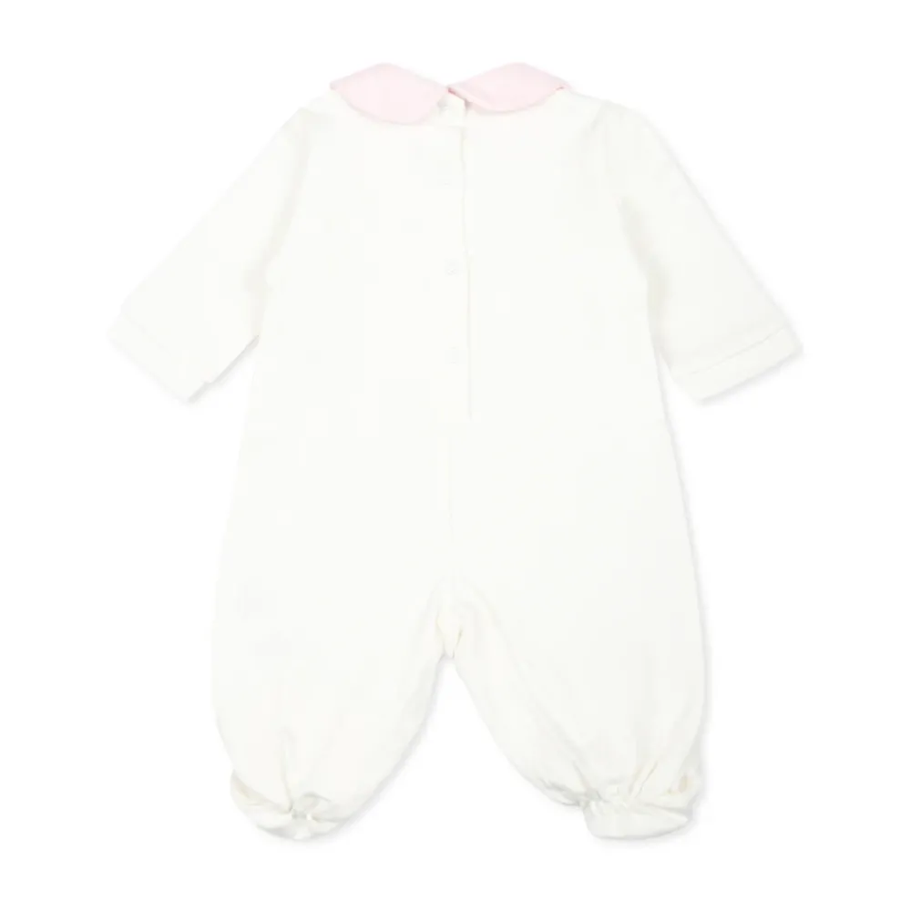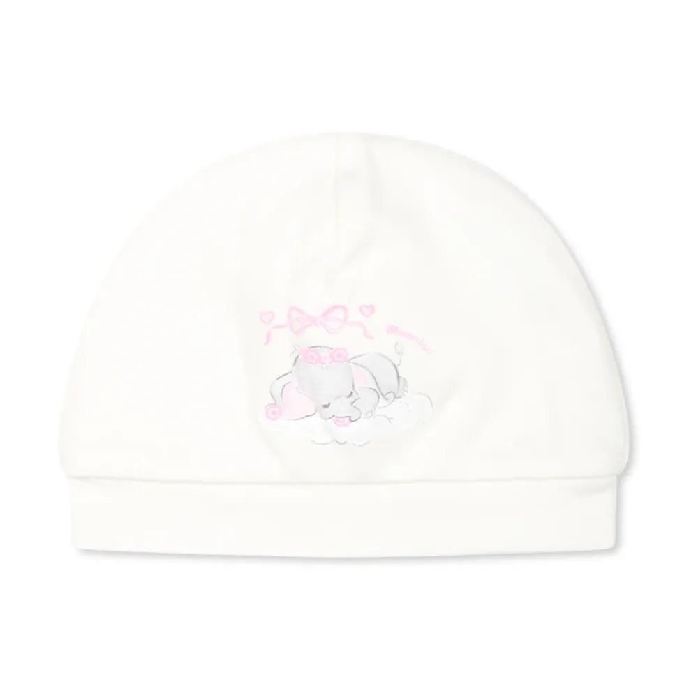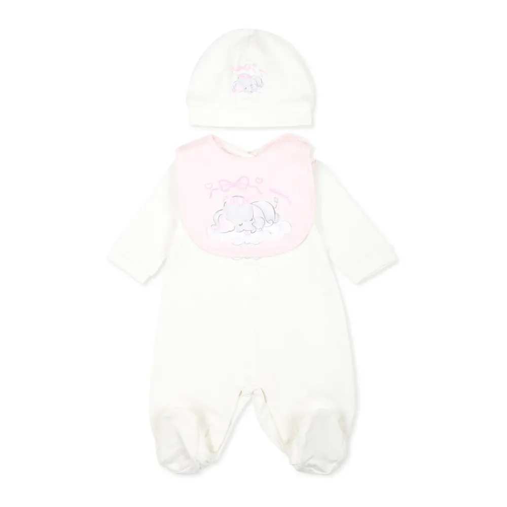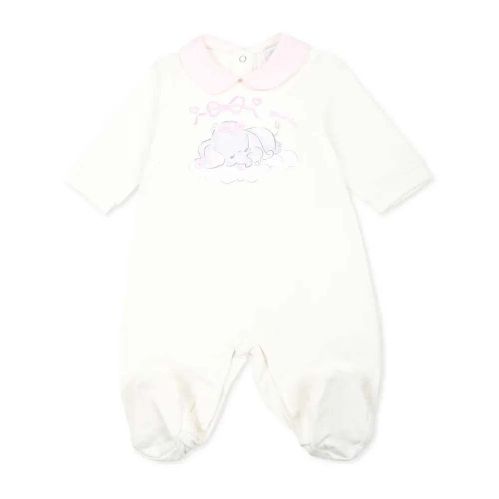 Kleed je kleine prinses in stijl met deze schattige Monnalisa witte babygrow set. De set bevat een katoenen babygrow met lange mouwen, een roze peter pan kraag, voetjes en drukknoopsluiting, een bijpassende roze slab met olifantenprint en logo, en een schattige muts. Gemaakt van 100% katoen. Machinewasbaar op 30°C.