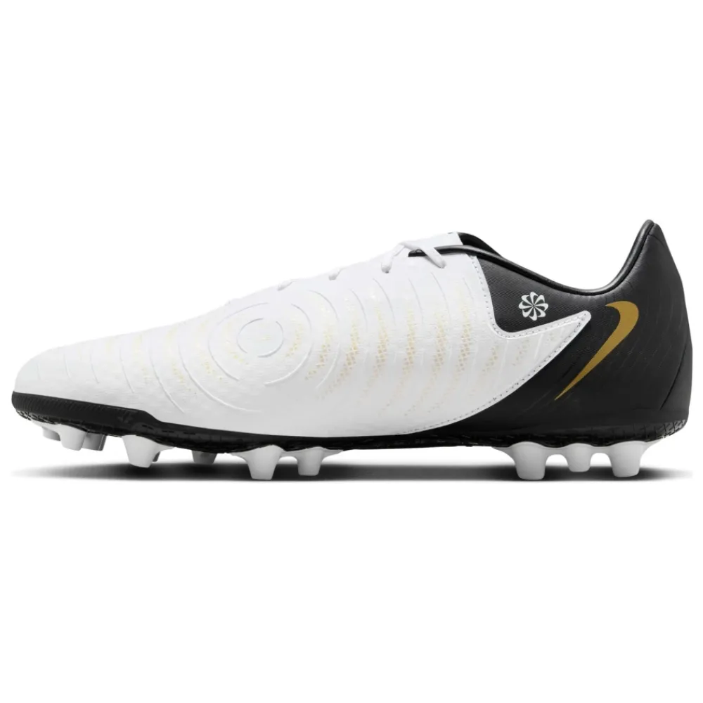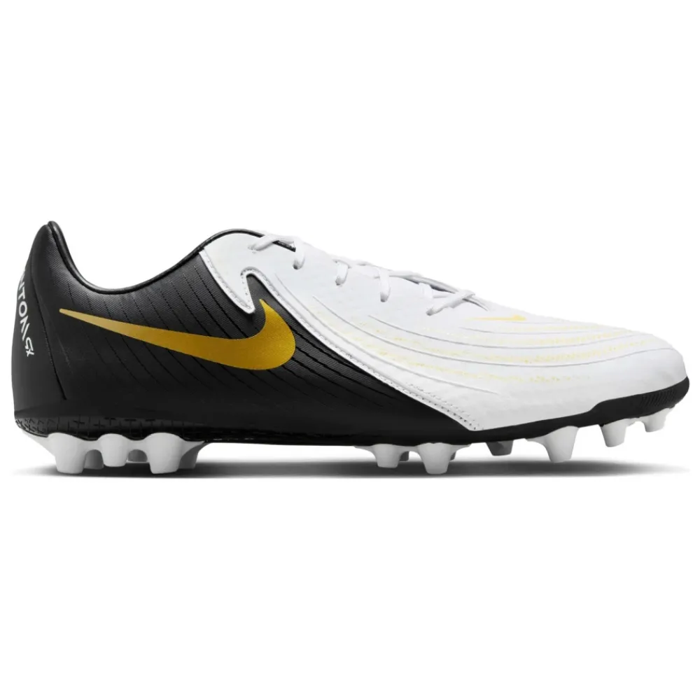 De Nike Phantom GX 2 Academy (stijl FJ2552-100) zijn laag uitgesneden voetbalschoenen, ontworpen voor snelle grip en precieze balbeheersing op kunstgrasvelden. Ze combineren een NikeSkin-schietzone met een Cyclone 360-noppenpatroon om wendbare bewegingen en een nauwkeurige balbehandeling te ondersteunen. Belangrijkste kenmerken: Wit | Zwart | Goud | Synthetisch (NikeSkin) | Cyclone 360-grip voor snelle wendingen | Verbeterde balbehandeling en controle | Geschikt voor kunstgrasvelden | Conische en tri-star noppen voor snelle richtingsveranderingen | Gewatteerde binnenzool voor comfort | Noppenconfiguratie geoptimaliseerd voor kunstgras | Laag model | NikeSkin-schietzone | Gestructureerd schietgebied | Vetersluiting | Afmetingen en pasvorm: Nauwsluitende pasvorm; overweeg een halve maat groter te bestellen.
