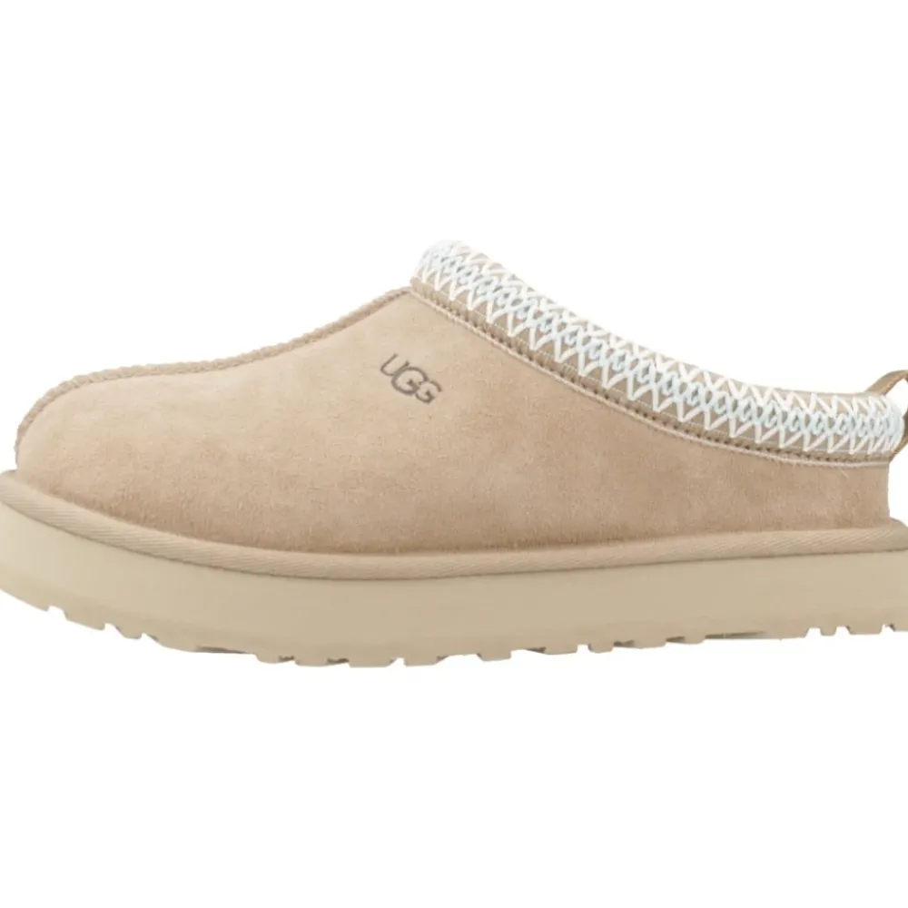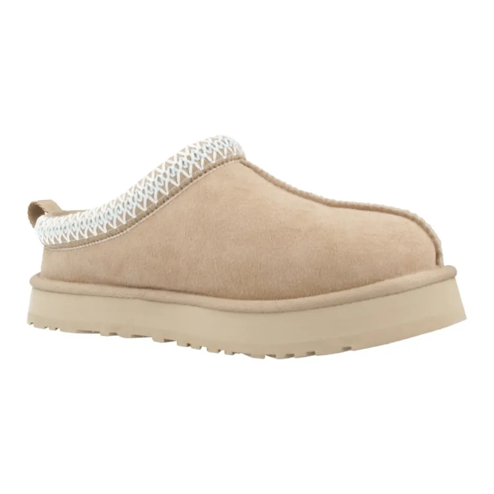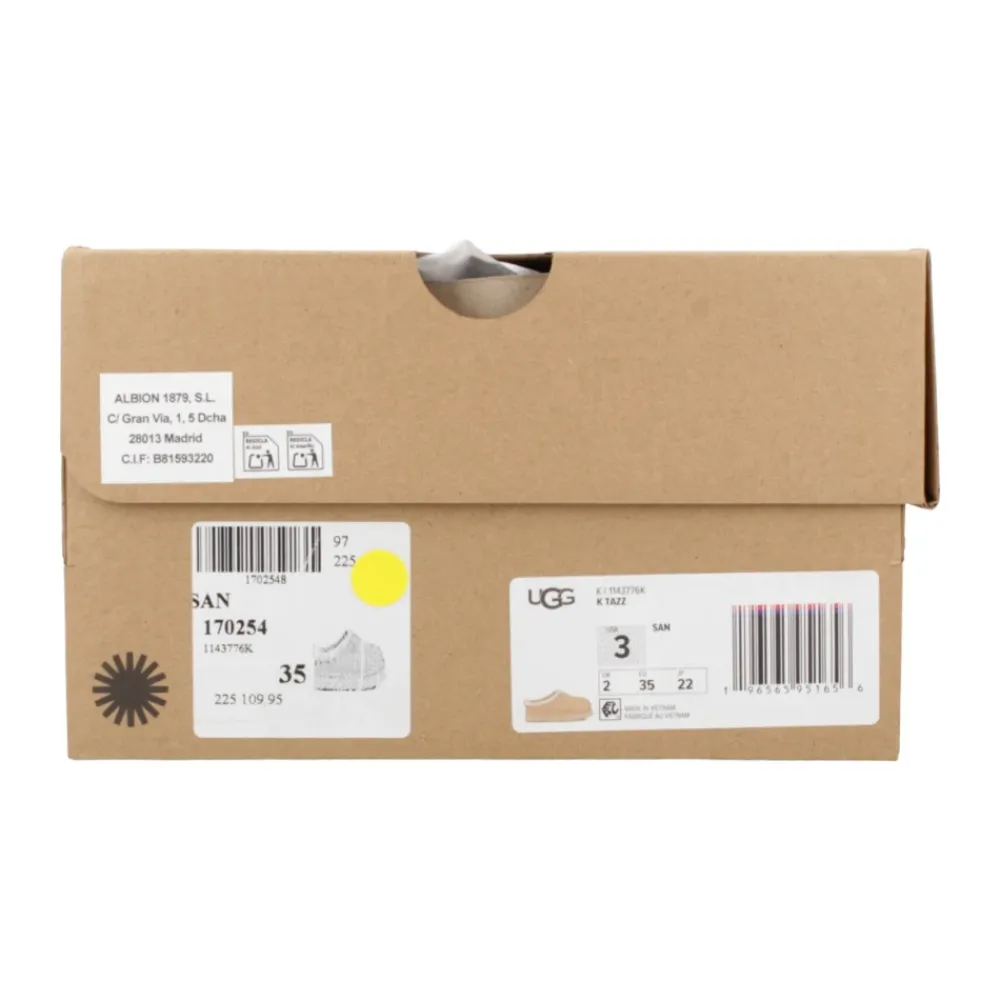 UGG Tazz geeft de Tasman-geïnspireerde clog een update met een platformzool van 2,54 cm en een bovenwerk van suède. Het combineert een pluche UGGplush-voering met een gedempte middenzool voor slipperachtig comfort binnenshuis en casual gebruik buitenshuis. Belangrijkste kenmerken: Beige | San | Suède | Vochtafvoerende voering | Anti-geur kraagbehandeling | Slip-on constructie | Gedempte binnenzool | Platform buitenzool voor extra demping | Gevlochten vampdetail | Verhoogde rand over de vamp | Trekkoord aan de hiel (varieert per kleur) | Afmetingen en pasvorm: ca. 2,54 cm platformhoogte | Samenstelling en verzorging: Suède (bovenwerk) | 60% wol, 40% lyocell (voering en binnenzool) | EVA (middenzool en buitenzool) | Polyester (textielbinding)