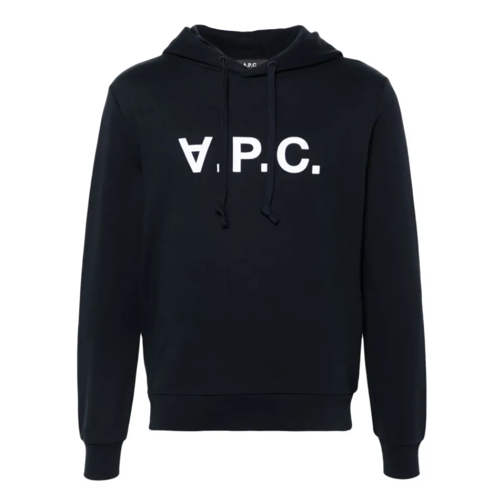 Upgrade je casual look met deze middernachtblauwe A.P.C. hoodie. Gemaakt van een katoenmix jersey met een flocked logo, trekkoord capuchon en geribbelde manchetten en zoom. Ontworpen met lange mouwen en Franse badstof voering. Let op: dit uniseks item is ingedeeld in standaard herenmaten en gemaakt van minstens 50% materialen.