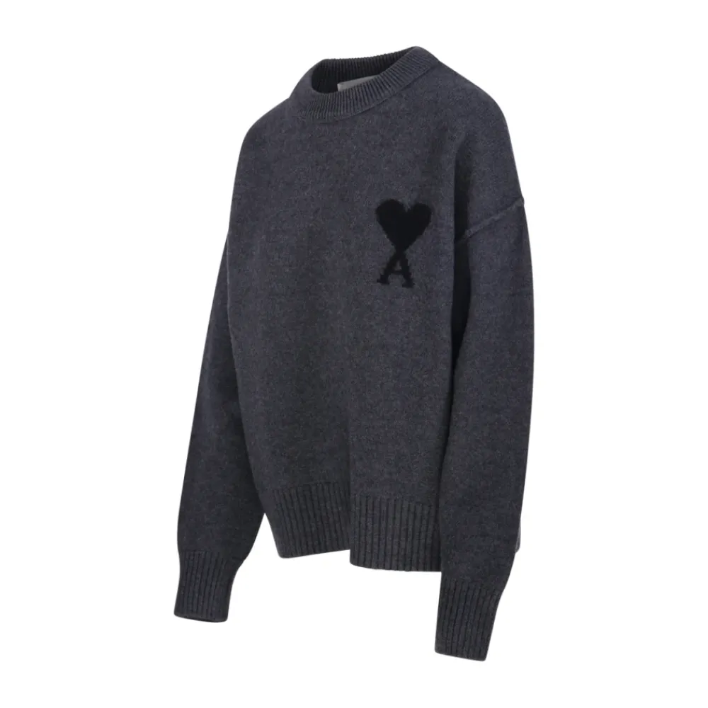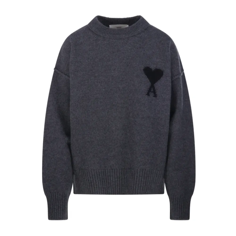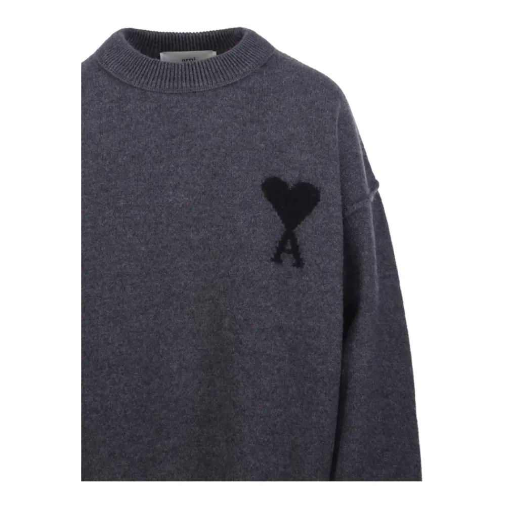 Upgrade je stijl met deze Ami Paris ronde hals trui in gemêleerd grijs en zwart, gemaakt van gevilt merinowol.