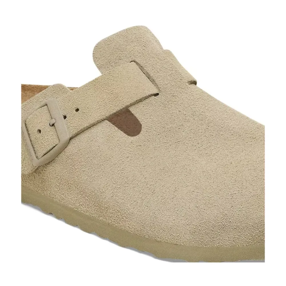 Upgrade je stijl met deze vervaagde beige khaki Birkenstock ‘Boston’ platte klomp sandalen voor vrouwen. Gemaakt met een zachte suède bovenkant, verstelbare gespband en kleurgecoördineerde details. Deze instapmuilen hebben een extreem lichte en flexibele EVA-loopzool, anatomisch gevormd kurk-latex voetbed, suède voering en leren binnenzool. Maat & Pasvorm: Klein, smalle breedte.