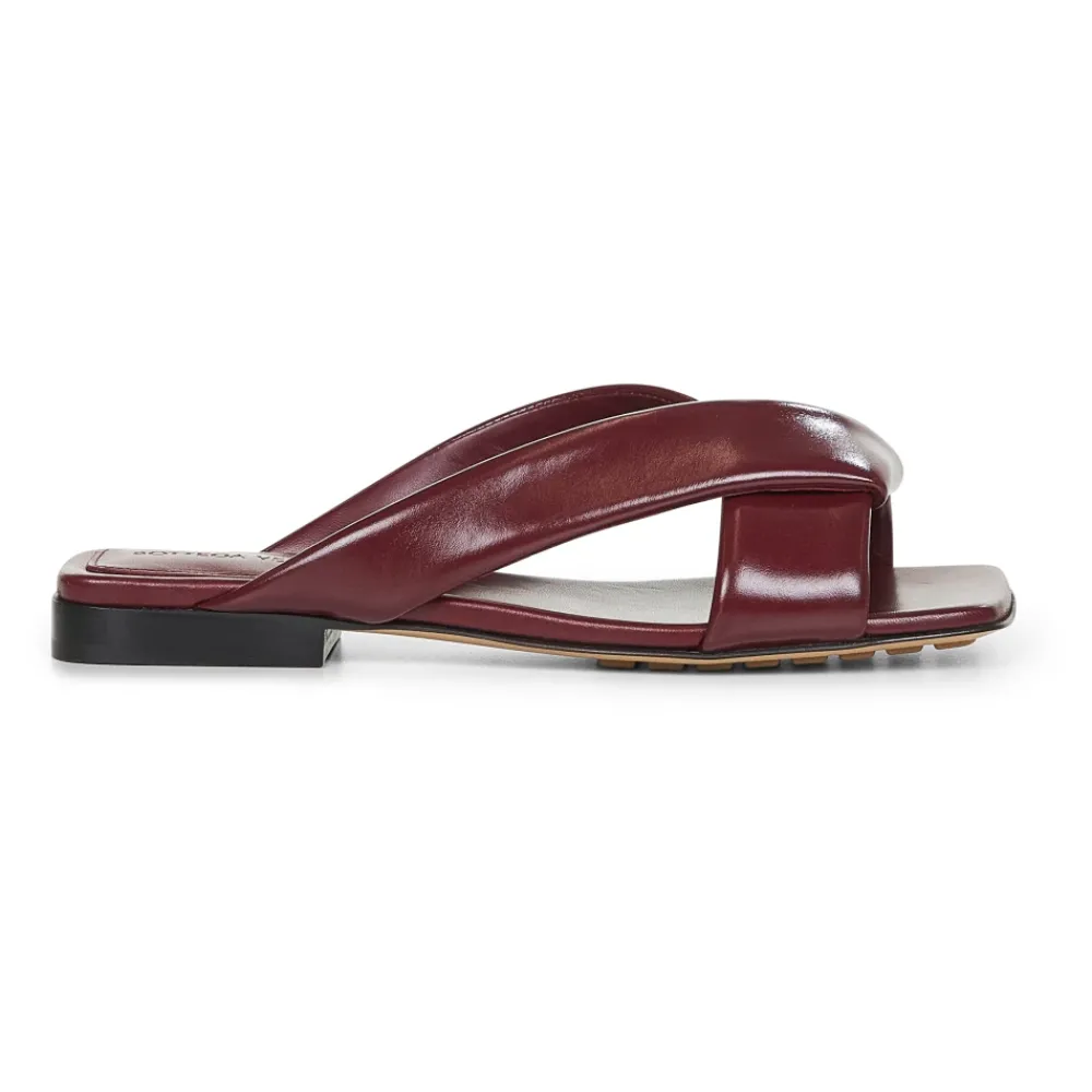 Stap de zomer in met deze elegante Bottega Veneta slippers, vervaardigd uit rijk bordeauxrood kalfsleer voor een verfijnde touch. Belangrijkste kenmerken: Rood | Kalfsleer | Vierkante neus | Gevoerde gedraaide banden | Lage gestapelde hak | Afmetingen en pasvorm: Normale pasvorm | Samenstelling en onderhoud: Leren voering | Rubberen geïnjecteerde buitenzool | Reinig met een zachte doek