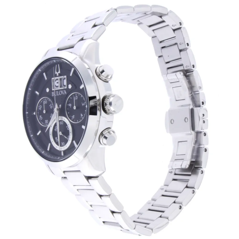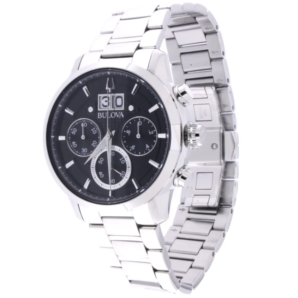 De Bulova Sutton Big Date Chronograph combineert een 44 mm roestvrijstalen kast met een zwarte wijzerplaat en een extra grote datumweergave voor nauwkeurige dagelijkse tijdwaarneming. Het combineert quartz-nauwkeurigheid met chronograaffunctionaliteit voor veelzijdige dagelijkse en dress-casual kleding. Belangrijkste kenmerken: Zwart | Zilver | Staal | Quartz uurwerk | Waterbestendig tot 30 m | Mineraalglas | Chronograaffunctie | Vouwsluiting met veiligheidsslot | Datumweergave | Extra grote datumweergave op 12 uur | Gewelfd/gebogen mineraalglas | Zwarte wijzerplaat met textuur | Afmetingen & pasvorm: Diameter kast: 44 mm | Dikte kast: 12 mm | Samenstelling & onderhoud: Kast: Staal | Armband: Staal | Glas: Mineraalglas | Uurwerk: Quartz | Reinig met een zachte doek. Vermijd langdurige blootstelling aan water en extreme temperaturen. Laat de batterij vervangen en onderhoud uitvoeren door een gekwalificeerde technicus.