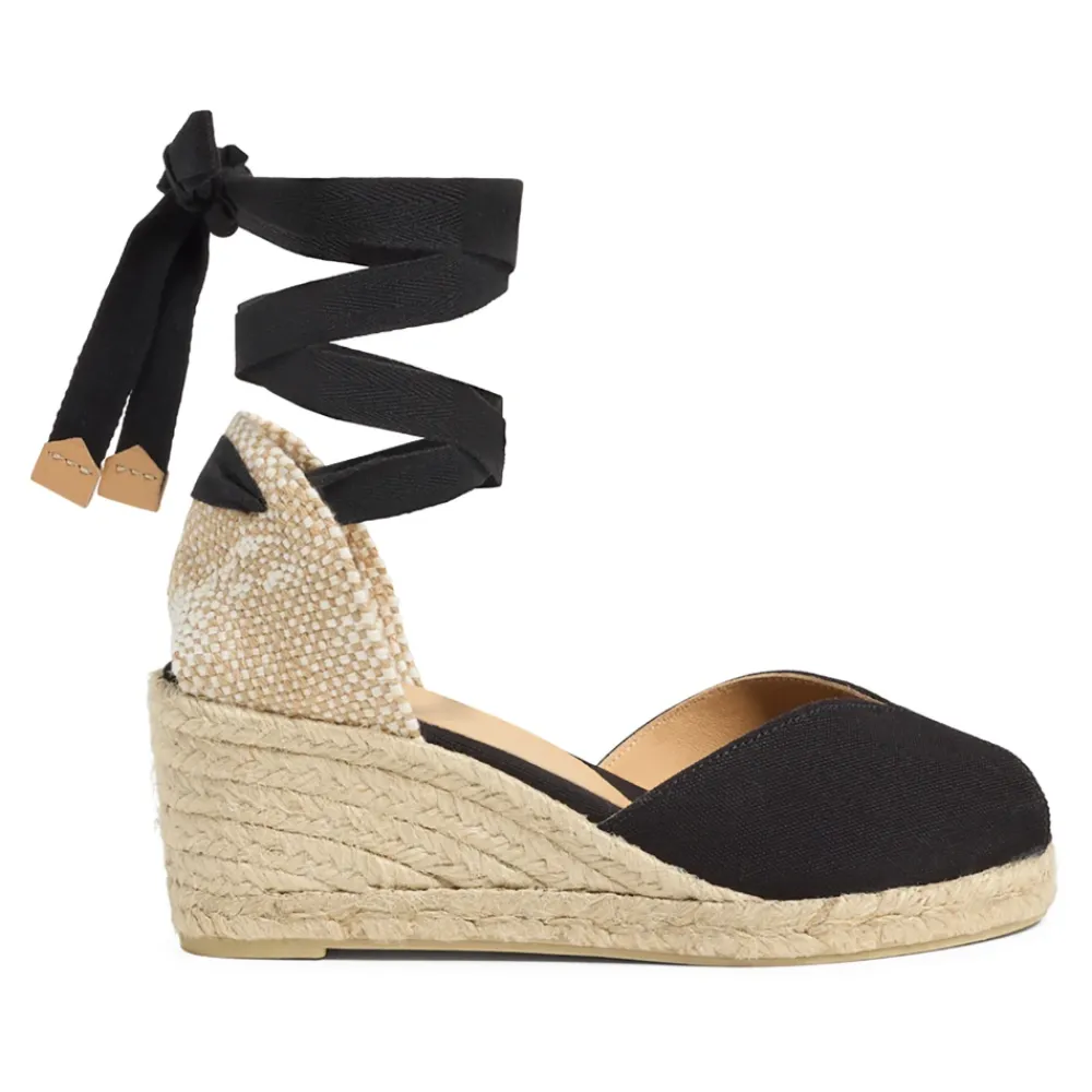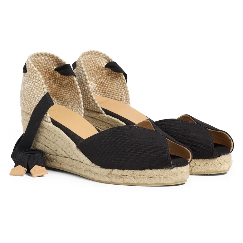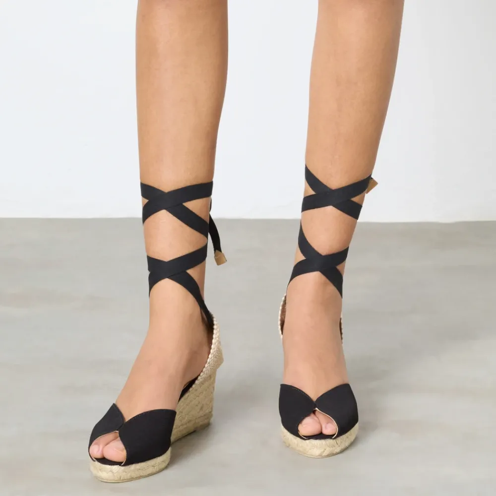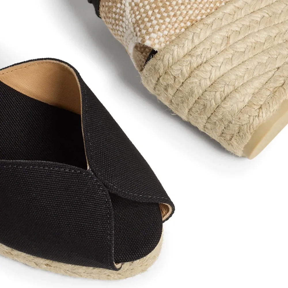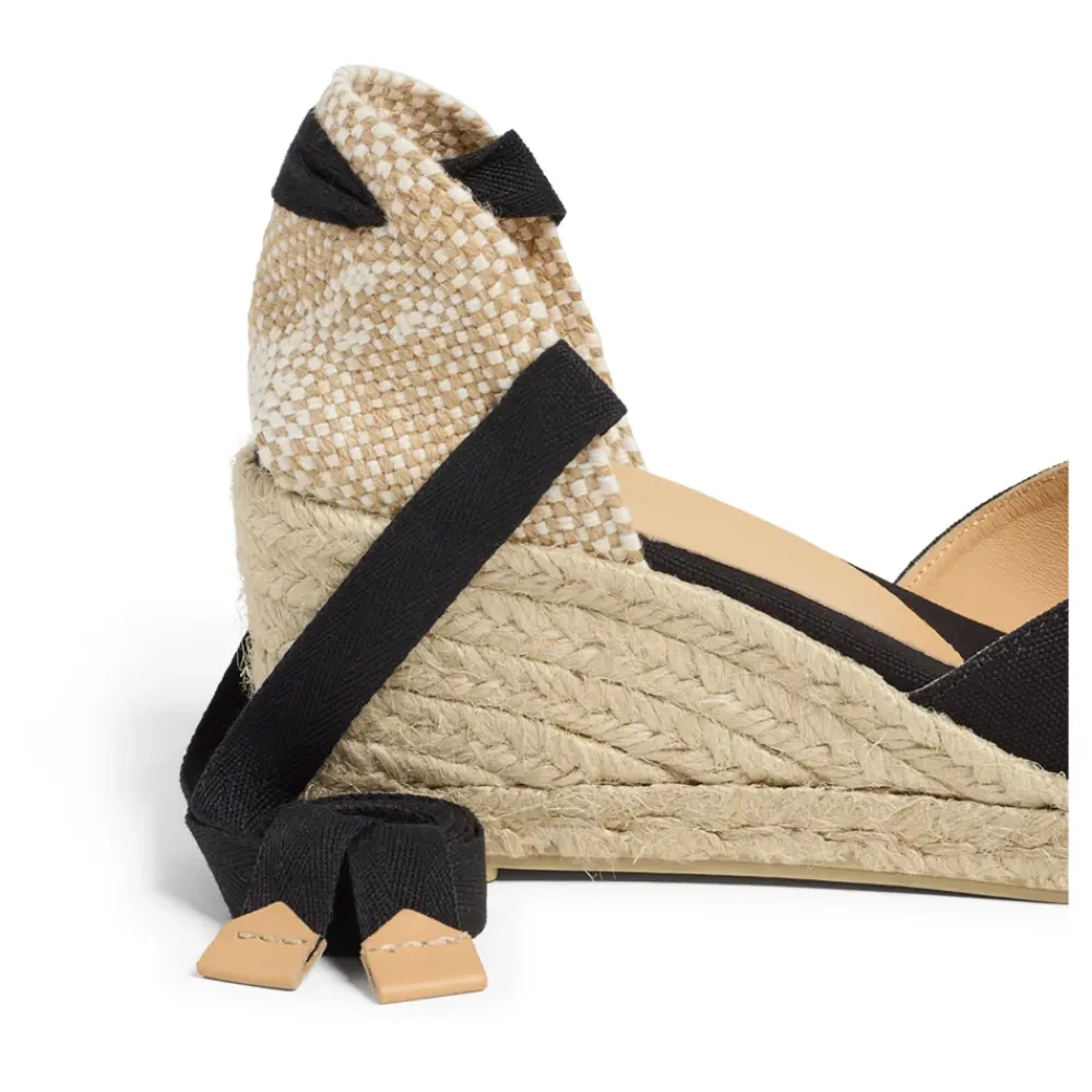 Verhoog je stijl met deze zwarte Castañer Bilina sleehakken. Met de hand vervaardigd in Spanje, deze sleehakken hebben een gevlochten hielkap, lint om de enkel en een comfortabele schapenvacht voering. Gemaakt van gecertificeerd katoen met een gevulkaniseerde rubberen zool. Totale hoogte: 7 cm; Plateauhoogte: 2 cm; Sleehakhoogte: 5 cm.