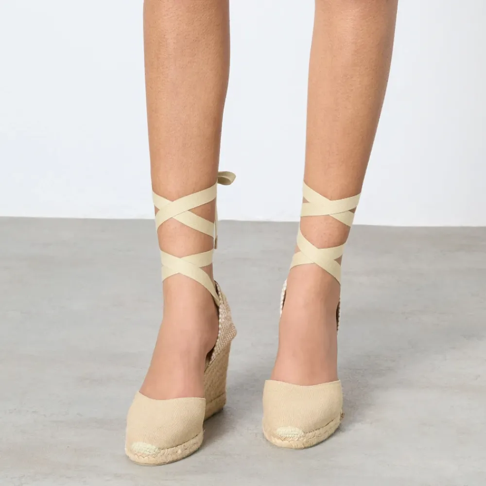 Verhoog je stijl met deze beige Castañer Carina sleehakken. Met de hand vervaardigd in Spanje, hebben deze sleehakken een gecertificeerde katoenen buitenkant met een gewassen afwerking. De ronde neus, gevlochten hielkap en lintgeknoopte enkel voegen een vleugje elegantie toe. De gevulkaniseerde rubberen zool en schapenvacht interieur zorgen voor comfort. Totale hoogte: 9 cm; Plateauhoogte: 2 cm; Sleehakhoogte: 7 cm.