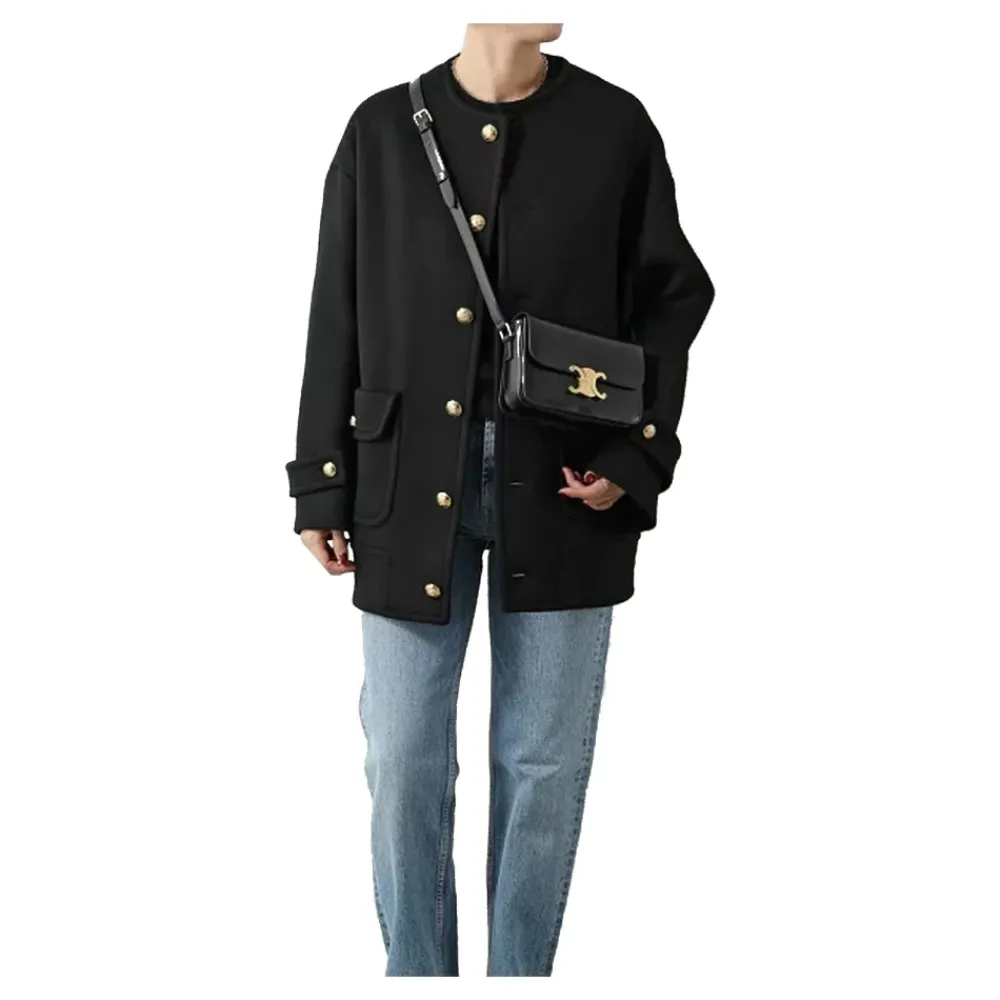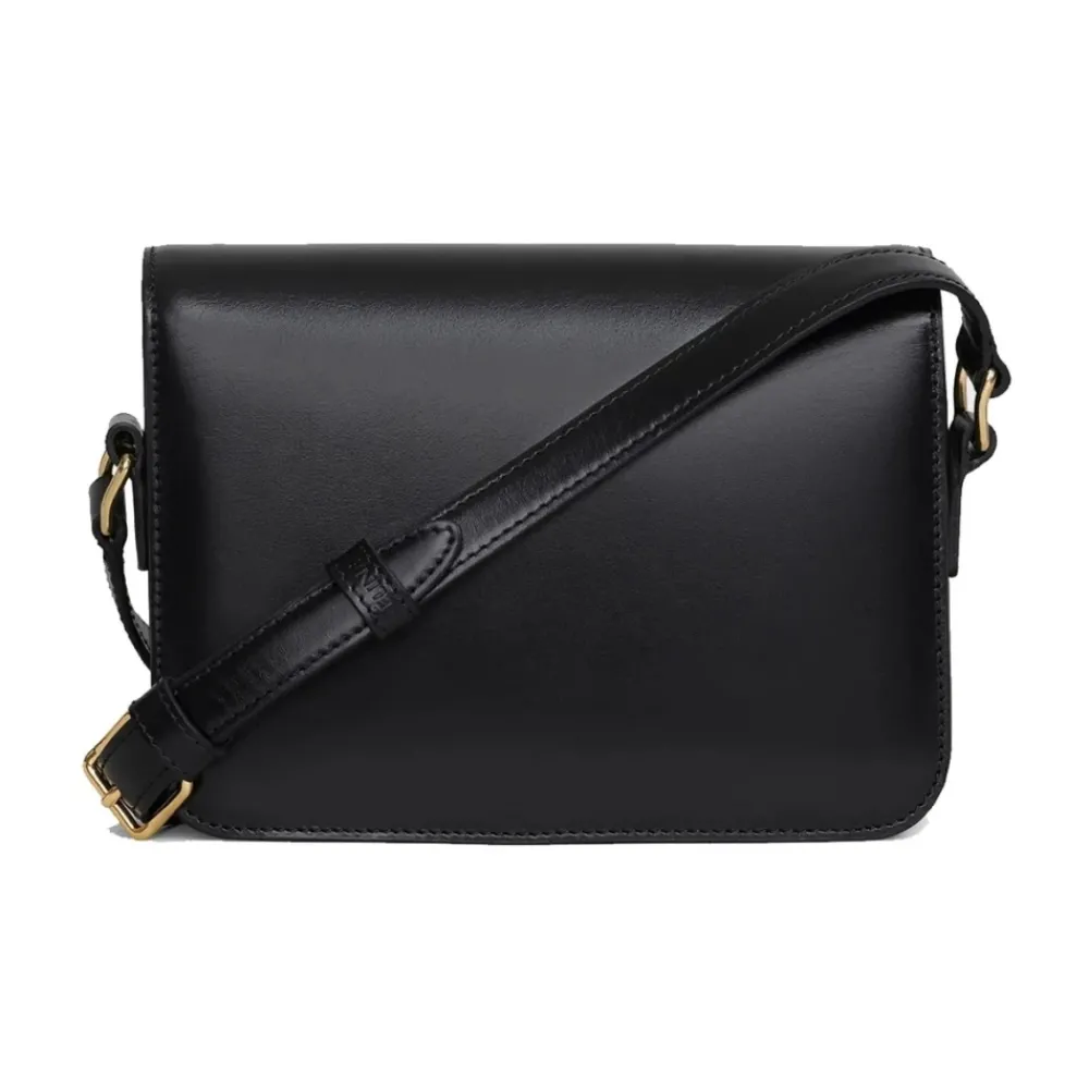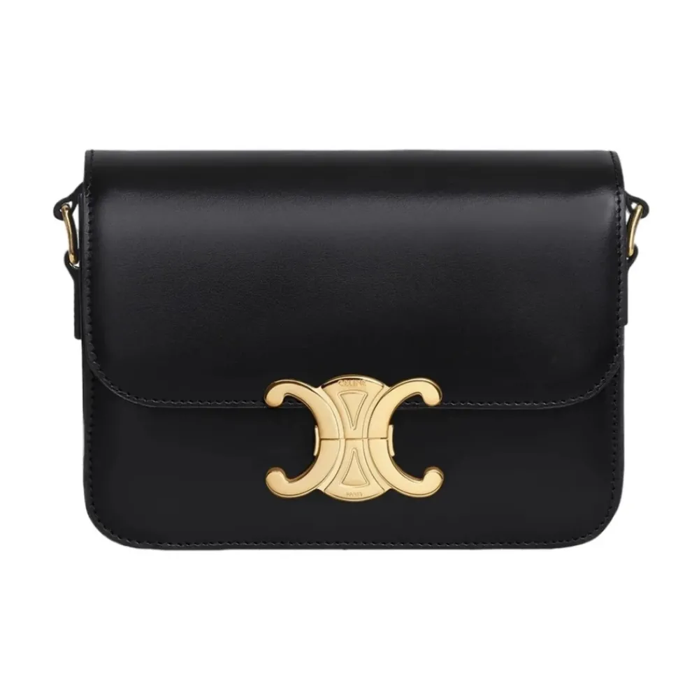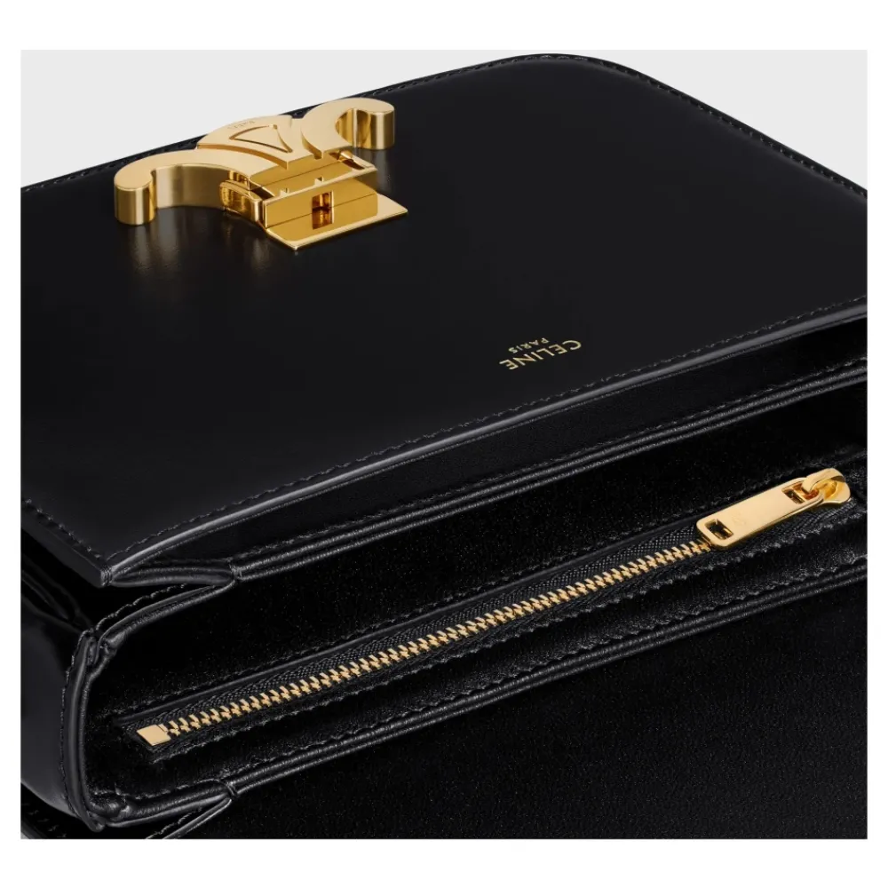 Upgrade je stijl met deze zwarte Celine ‘Teen Triomphe’ crossbodytas. Gemaakt van glanzend kalfsleer met voering van lamsvacht, heeft het een lange verstelbare band, sluiting met goudkleurig metaal en meerdere zakken voor je essentiële spullen. Afmetingen: 18,5 cm x 13,5 cm x 7 cm. Een must-have voor de moderne vrouw.