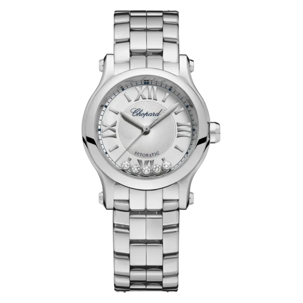 Upgrade je stijl met dit Chopard horloge voor vrouwen. Met een zilveren wijzerplaat met 5 zwevende diamanten, roestvrijstalen kast en armband, en saffierglas. Waterbestendig tot 30 meter, is dit automatische horloge zowel elegant als functioneel.