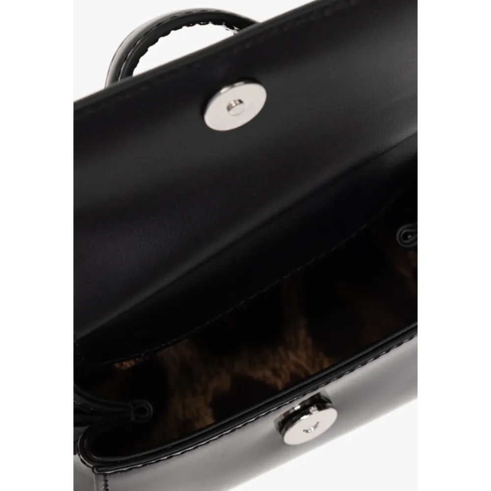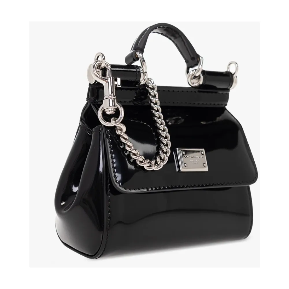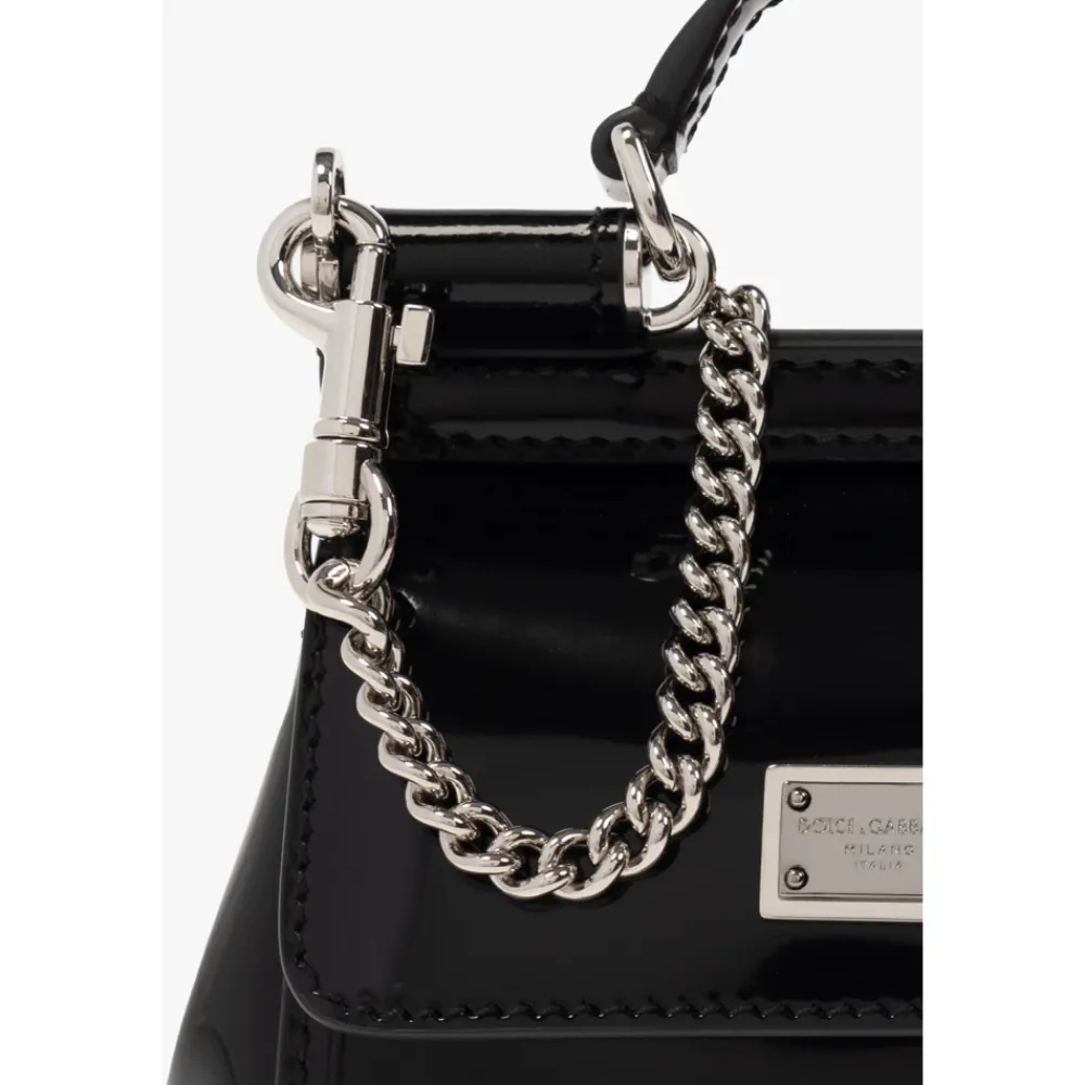 Zwarte Sicily Mini schoudertas van Dolce & Gabbana x Kim. Gemaakt van lakleer, dit ontwerp sluit met een drukknoop en toont een metalen logo-plaque op de flap, een half ronde handgreep, een afneembare kettingriem, zilverkleurige metalen hardware en één interne compartiment.Hoogte: 9,5 cmBreedte: 11 cmAfmetingen van het modelHoogte: 176 cmBorst: 85 cmTaille: 60 cmHeupen: 89 cm