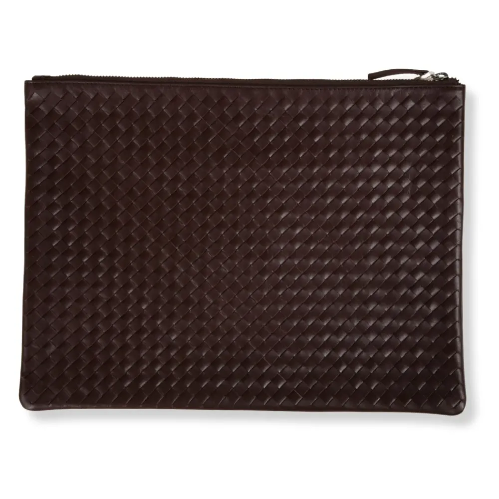 De Dragon Diffusion A4 Pochette is een handgeweven leren clutch, ontworpen voor A4-documenten. De clutch combineert een kenmerkende intrecciato buitenkant met een ritssluiting aan de bovenkant voor veilig en verfijnd dagelijks gebruik. Belangrijkste kenmerken: Bruin | Donkerbruin | Kalfsleer | constructie | Ritssluiting bovenaan | Enkel hoofdvak | Gevoerde binnenkant | Handgeweven intrecciato buitenkant | Slank A4 silhouet | Minimalistisch clutch ontwerp | Afmetingen & pasvorm: Breedte: 36 cm | Hoogte: 27 cm | Diepte: 2 cm | One size | Geschikt voor A4-documenten | Samenstelling & onderhoud: 100% kalfsleer | Specialistische leerreiniging.