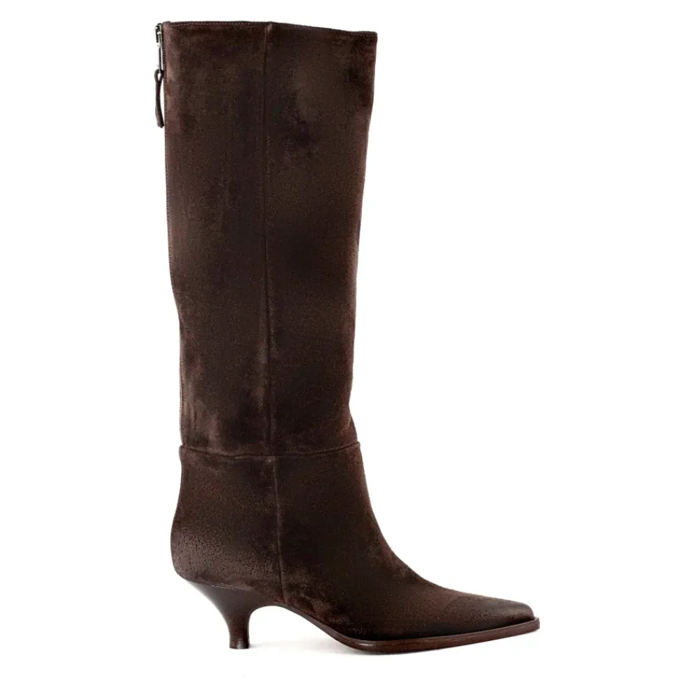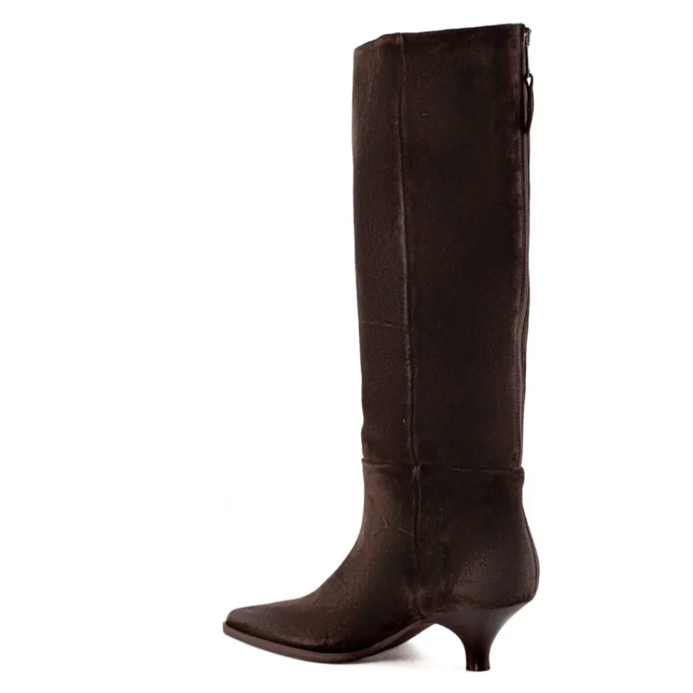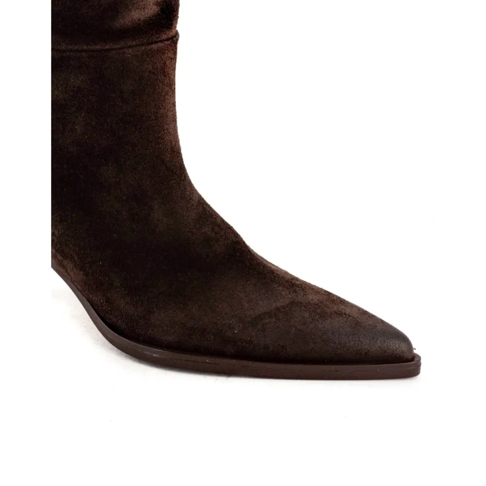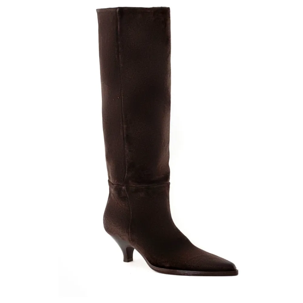 Verhoog je stijl met deze Elena Iachi haklaarzen. Gemaakt van bruin suède, hebben deze hoge laarzen een puntige neus, ritssluiting aan de achterkant, leren zool en een comfortabele hakhoogte van 4,5 cm.