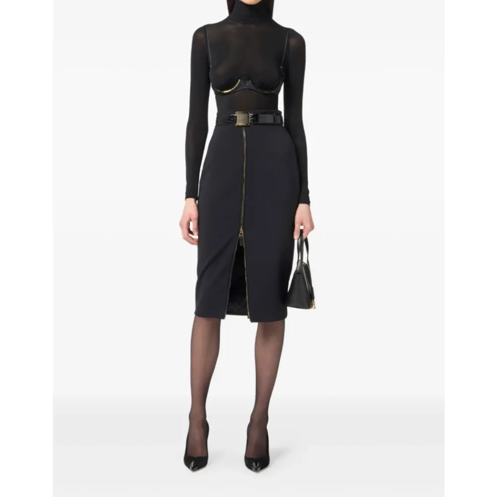 Upgrade je stijl met deze zwarte Elisabetta Franchi midi-rok met rits aan de voorkant en slanke pasvorm, perfect voor de moderne vrouw. De modellen van Elisabetta Franchi zijn over het algemeen nauwsluitend ontworpen. Als je tussen twee maten in zit, raden wij je aan een maat groter te nemen.