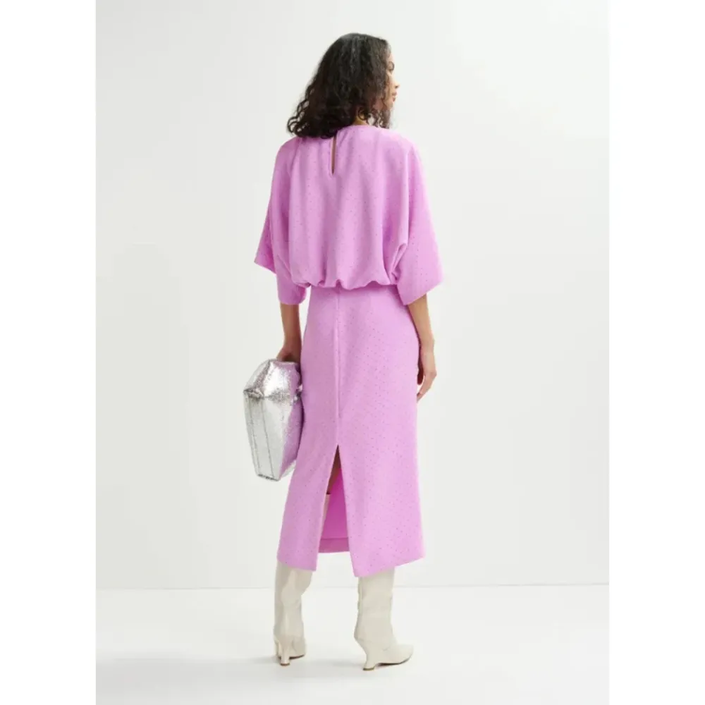 De Essentiel Antwerp Handsome Dress combineert een relaxed midi-silhouet met een all-over versiering van glazen strassteentjes. Ideaal voor avondevenementen en speciale gelegenheden, het balanceert zacht volume met gestructureerde schouders voor een verfijnde, stralende look. Belangrijkste kenmerken: Lila | Polyester | Gevulde schouders voor extra structuur | All-over versiering van glazen strassteentjes | Ronde halslijn | Wijde 3/4-lange vleermuismouwen | Achter split | Afmetingen & pasvorm: Maat 36 — Lengte voorkant: 138 cm | Maat 36 — Taille: 65 cm | Relaxte pasvorm | Valt normaal qua maat | Midi-lengte | Model is 175 cm lang en draagt maat 36 | Samenstelling & onderhoud: 100% polyester | Vulling: 100% polyester | Strassteentjes: 100% glas | Handwas