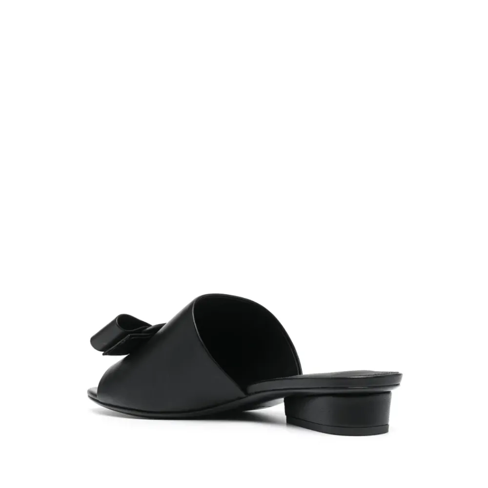 De Salvatore Ferragamo sandalen met dubbele strik combineren een verfijnde constructie van lamsleer met de kenmerkende dubbele strik van het label op de wreef. Ontworpen voor een gepolijste, alledaagse look, ze balanceren geklede details met een lage, comfortabele hak. Belangrijkste kenmerken: Zwart | Lamsleer | Open teen | Binnenzool met merklogo | Lage hak | Strikdetails | Gegraveerd logo | Afmetingen & pasvorm: US schoenmaat 4 | Samenstelling & verzorging: Bovenkant: 100% lam | Voering: 100% leer | Zool: Leer en rubber