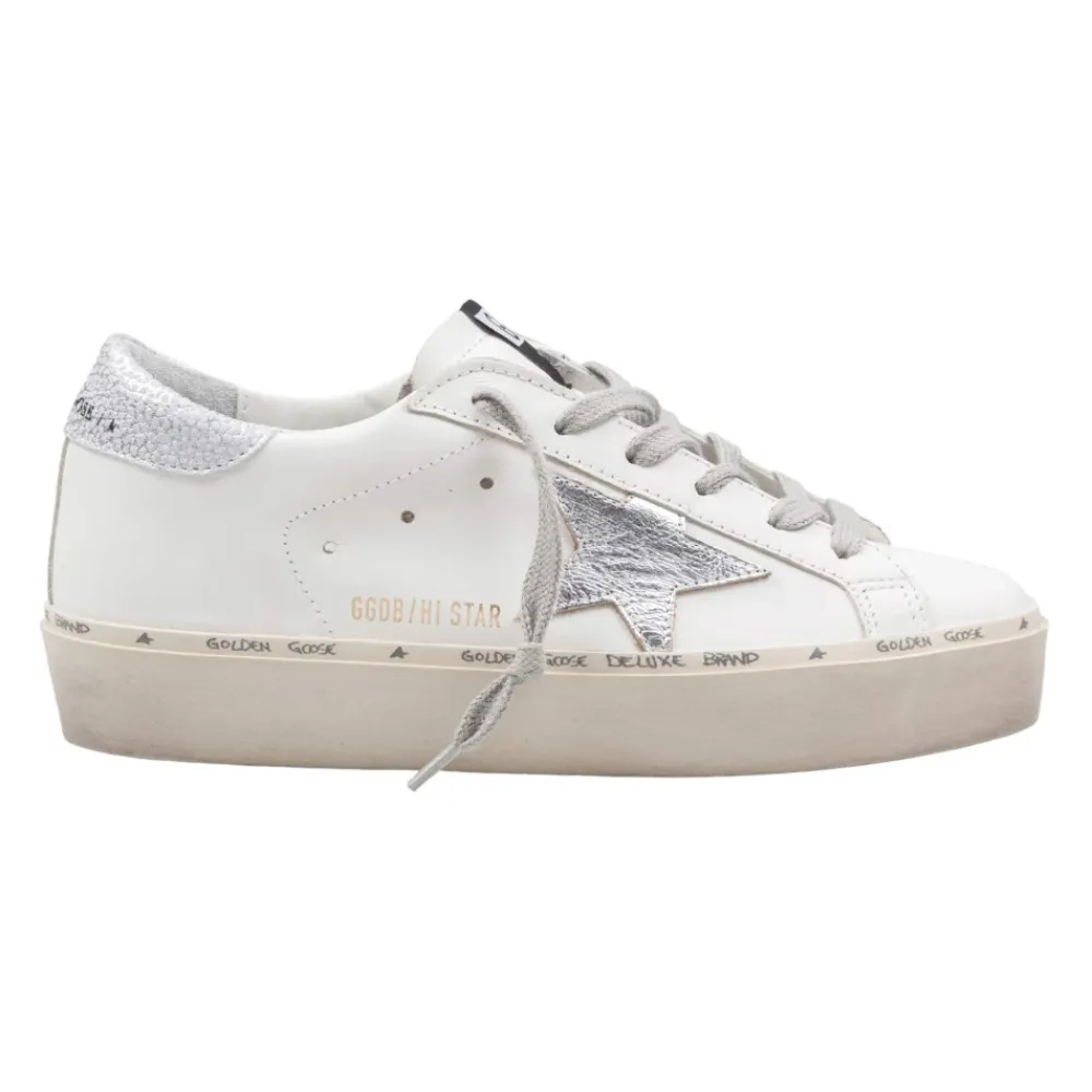 De Golden Goose Hi Star Sneakers combineren de iconische Super-Star inspiratie van het merk met een verhoogd platformprofiel. Dit witte leren paar wordt gekenmerkt door een metallic zilveren ster en een bijpassende zilveren hiel voor een vintage-geïnspireerde, alledaagse sneaker. Belangrijkste kenmerken: Wit | Zilver | Leer | Sluiting met veters | Binnenvoering van leer en stof | Rubberen zool | Ronde neus | Zilveren ster applicatie | Contrasterende zilveren hiel | Samenstelling & verzorging: Leer (bovenkant) | Leer en katoenen badstof (voering) | Rubber (zool)