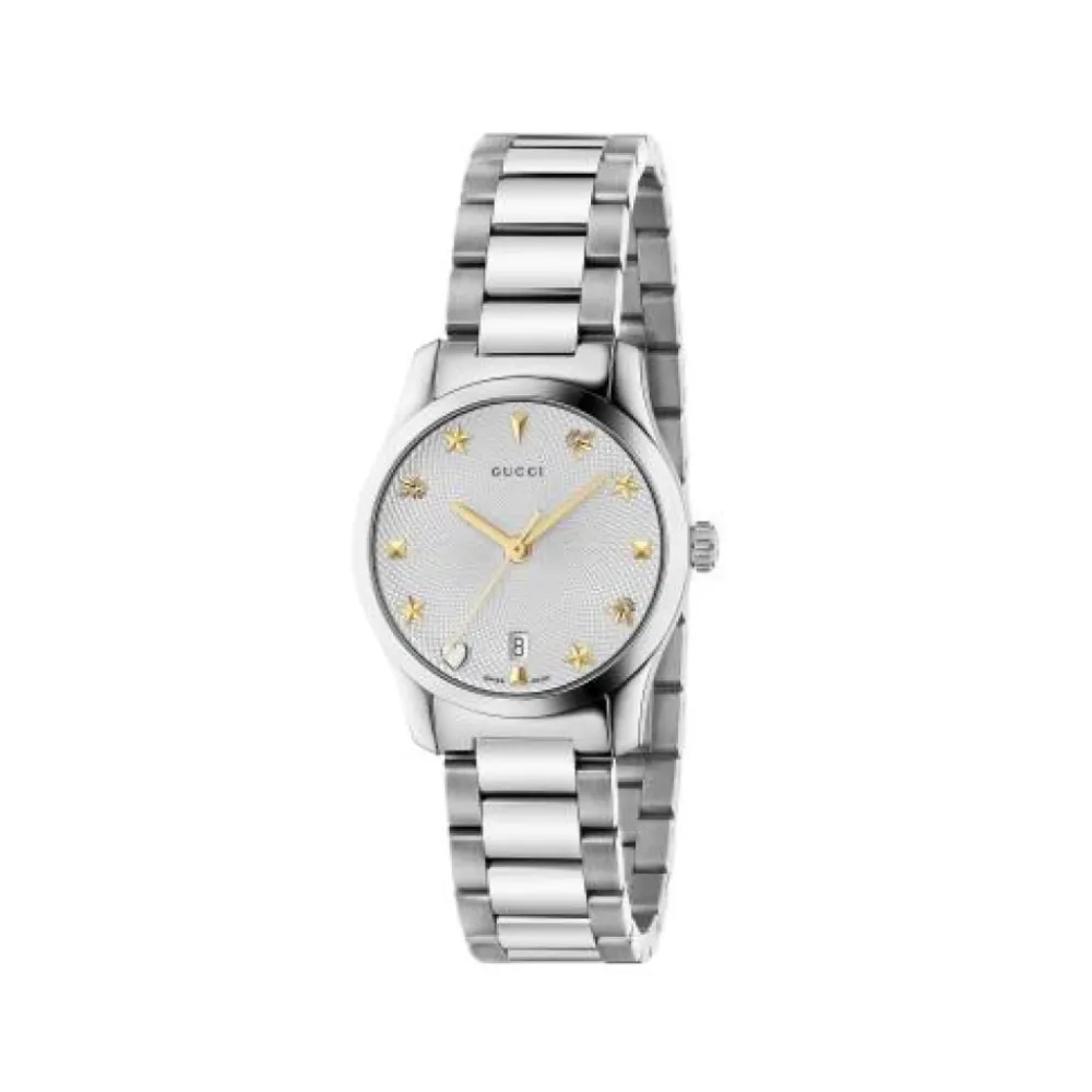 De Gucci G-Timeless Iconic Watch 27 is een 27 mm roestvrijstalen uurwerk uit de G-Timeless collectie van Gucci, ontworpen voor dagelijks gebruik met kenmerkende huisstijlelementen en een verfijnde zilveren guilloché wijzerplaat. Belangrijkste kenmerken: Grijs | Staal | Waterbestendigheid: 5 ATM (50 meter) | Zwitsers quartz uurwerk (ETA F04.115 of Ronda 785) | Saffierglas met antireflecterende coating | Swiss Made | Verstelbare stalen armband (110 mm–170 mm) | Datumweergave op 6 uur | Guilloché zilveren wijzerplaat | Goudkleurige huisstijlelementen (bij, ster, hart) | Gepolijste roestvrijstalen bezel | Afmetingen & pasvorm: Kastgrootte: 27 mm | Bandgrootte: van 110 mm tot 170 mm | Verstelbare armband pasvorm | Samenstelling & verzorging: Kast: Staal | Wijzerplaat: Messing | Glas: Saffierglas (antireflecterende coating) | Band: Staal | Uurwerk: ETA F04.115 of Ronda 785 quartz (Swiss Made) | Afnemen met een zachte doek. Vermijd sterke chemicaliën en langdurige blootstelling aan vocht. Laat onderhoud uitvoeren door een geautoriseerde horlogetechnicus.