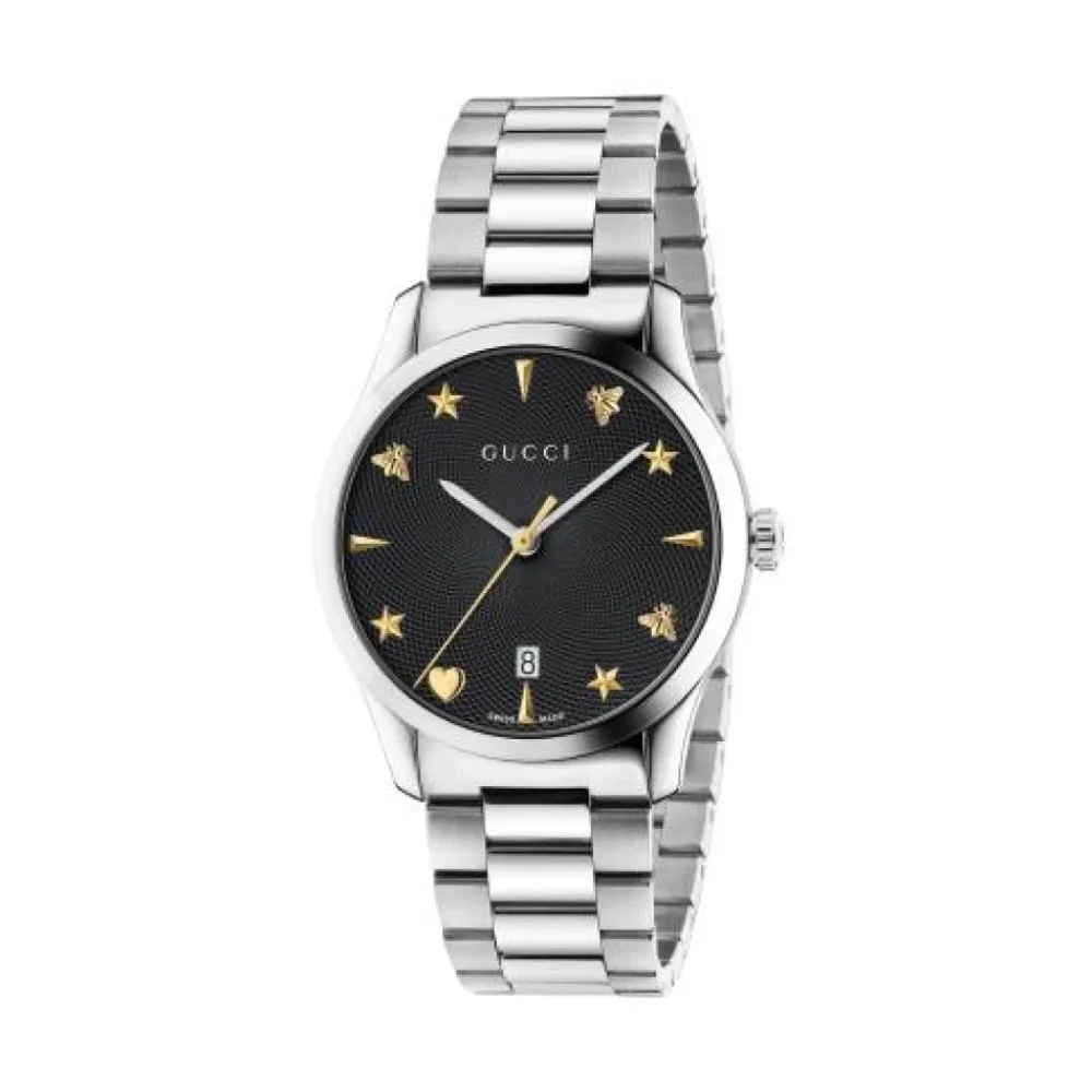 De Gucci G-Timeless Iconic horloge combineert een 38 mm roestvrijstalen kast met een zwarte guilloché wijzerplaat met Gucci’s kenmerkende motieven. Het is ontworpen als een verfijnd, alledaags horloge met een stalen armband en veilige vouwsluiting. Belangrijkste kenmerken: Roestvrij staal | Zwart | Roestvrij staal | Waterbestendig tot 5 ATM | Zwitsers quartz uurwerk | Krasbestendig saffierglas | Datumweergave op 6 uur | Roestvrijstalen armband met drievoudige vouwsluiting | Guilloché wijzerplaat met kenmerkende bij-, ster- en hartmotieven | Afmetingen & pasvorm: Diameter kast: 38 mm | Samenstelling & onderhoud: Roestvrij staal | Saffierglas