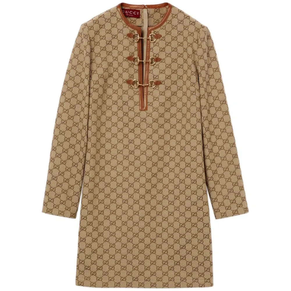 Verhoog uw stijl met de Gucci GG Canvas Jurk, met een chique camel en donkerbruin kleurenpalet. Deze jurk combineert een flatterende pasvorm met elegante designelementen, waardoor hij perfect is voor elke gelegenheid. Belangrijkste kenmerken: Camel | Donkerbruin | Katoen | Polyester | Lamsleer | Horsebit detail | Afmetingen en pasvorm: Flatterende pasvorm | Samenstelling en onderhoud: 70% Katoen | 30% Polyester | 100% Lamsleer