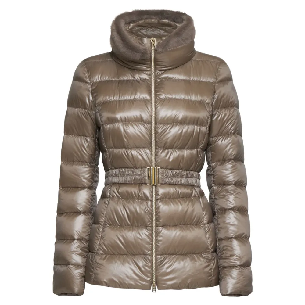 Blijf warm en stijlvol in deze Herno Claudia gewatteerde nylon donsjas in een chique taupe tint. Ontworpen voor vrouwen, deze jas heeft een hoge kraag afgezet met bont, een ritssluiting aan de voorkant, een elastische tailleband met een goudkleurige gesp, zijzakken met rits en een logoplaatje op de achterkant. Gemaakt buiten de EU. Stofdetails: beige.