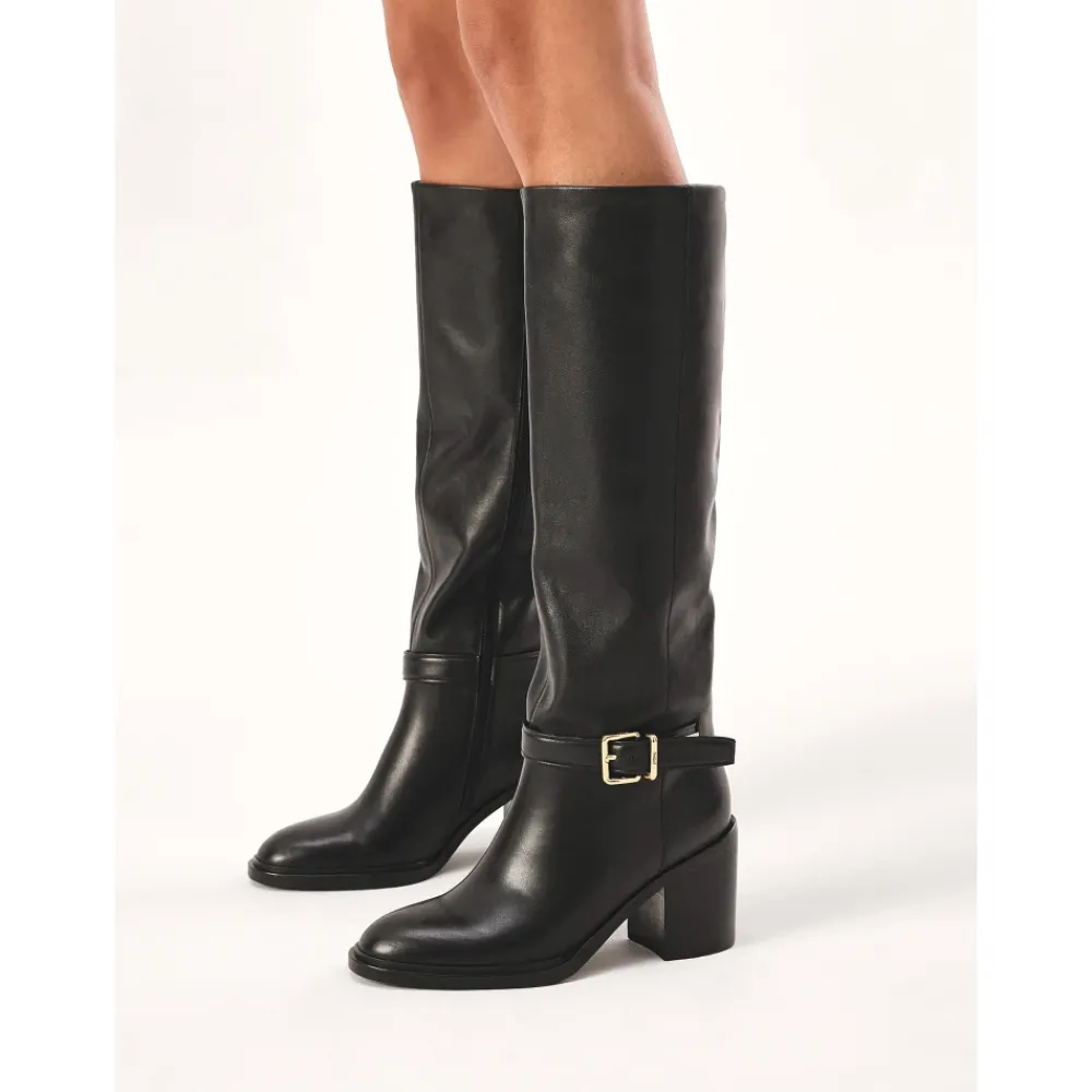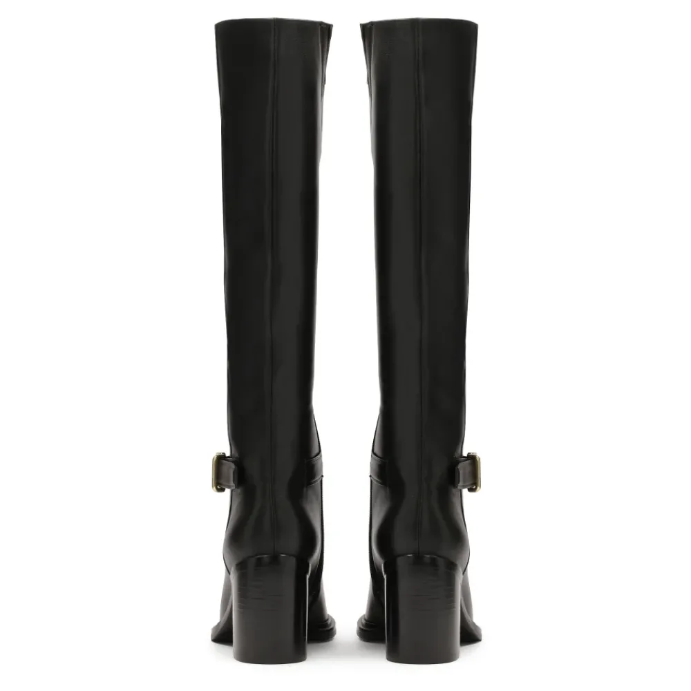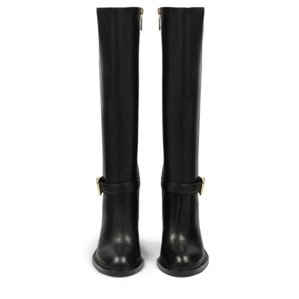 Eenvoudige, minimalistische laarzen gemaakt van zwart natuurlijk leer hebben een hoge, brede hak die stabiliteit en comfort biedt en tegelijkertijd een paar extra centimeters in hoogte toevoegt. De ronde neuskappen geven de schoenen een klassieke maar tijdloze uitstraling. Het bovendeel reikt net onder de knie en heeft een lange rits voor gemakkelijk aan- en uittrekken. Een extra decoratief element is een riem met een gesp, geplaatst op het onderste deel van het bovendeel. Dit subtiele detail voegt een stijlvolle touch toe aan de laarzen, zonder afbreuk te doen aan hun minimalistische karakter. De laarzen zijn een uitstekende keuze voor verschillende gelegenheden, zowel voor dagelijkse als meer formele outfits. Dankzij hun eenvoud en elegantie zijn ze gemakkelijk te combineren met een verscheidenheid aan kledingstukken en creëren ze modieuze en stijlvolle sets. De voering van zacht schapenleer garandeert hoog comfort, en de stoffen bontvoering zorgt voor een warm gevoel op koude dagen.