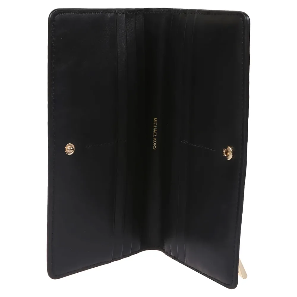 Upgrade je stijl met deze Michael Kors leren portemonnee in het zwart. Voorzien van een drukknoopsluiting, een externe ritszak en meerdere vakken voor contant geld en creditcards. Afmetingen: 19×9.
