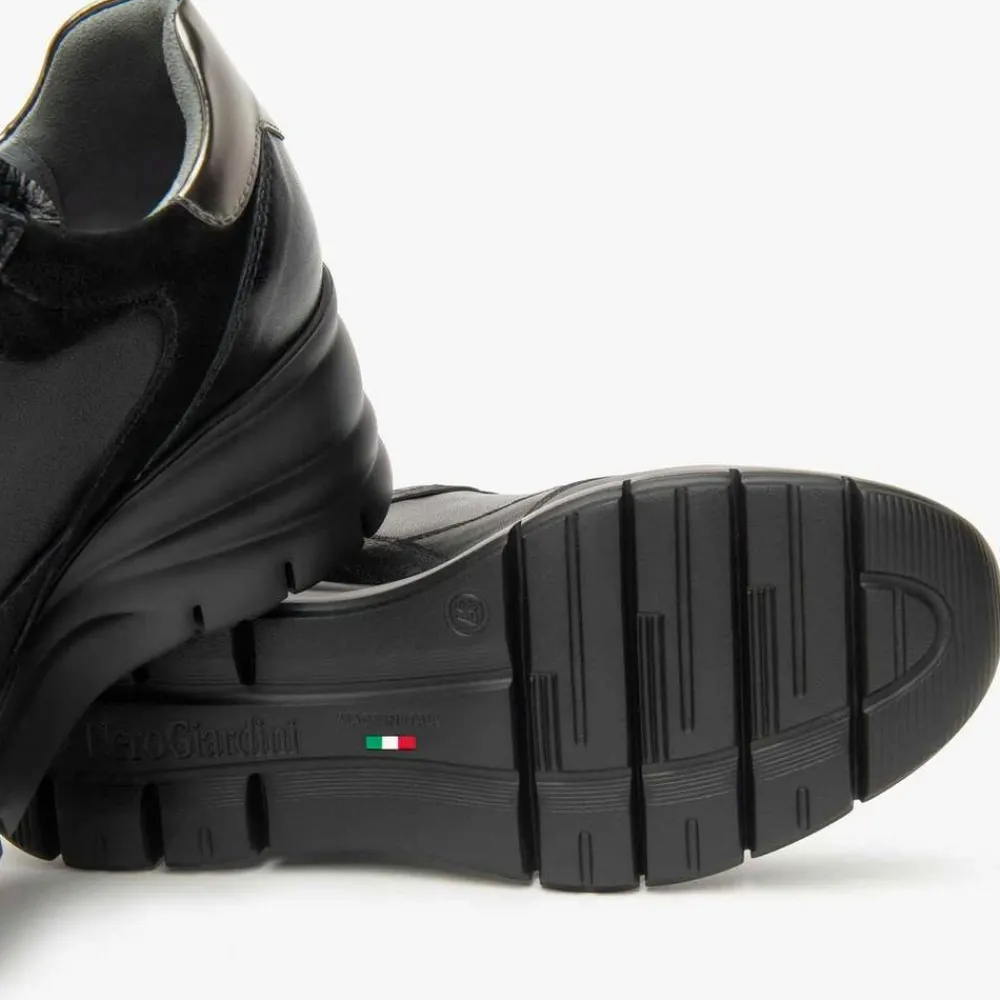 Nerogiardini Lace-up Boots combineren een bovenwerk van leer en technisch materiaal met een sleehak van 6 cm voor stabiel, dagelijks draagcomfort in de herfst/winter. De uitneembare DryGo!®-binnenzool biedt zweetabsorptie, sneldrogende werking en memory foam-demping voor de hele dag comfort. Belangrijkste kenmerken: Zwart | Leer en technisch materiaal | DryGo!®-binnenzool: zweetabsorptie en sneldrogend | Memory foam-demping voor comfort | Uitneembare binnenzool (DryGo!®) | Ritssluiting voor gemakkelijk aan- en uittrekken | Vetersluiting voor verstelbare pasvorm | Silhouet met veters en ritssluiting | Sleehak (zeppa) | Tricolore detail op zool en verpakking (Made in Italy) | Afmetingen & pasvorm: Hakhoogte: 6 cm | Normale pasvorm | Comfortabele pasvorm | Samenstelling & onderhoud: Bovenwerk: Leer en technisch materiaal | Voering: Leer en textiel | Buitenzool: Rubber | Binnenzool: Uitneembaar DryGo!® (memory foam) | Reinigen met een vochtige doek. Niet in de wasmachine. Breng indien nodig leerconditioner aan op de lederen delen. Laat de uitneembare binnenzool aan de lucht drogen.