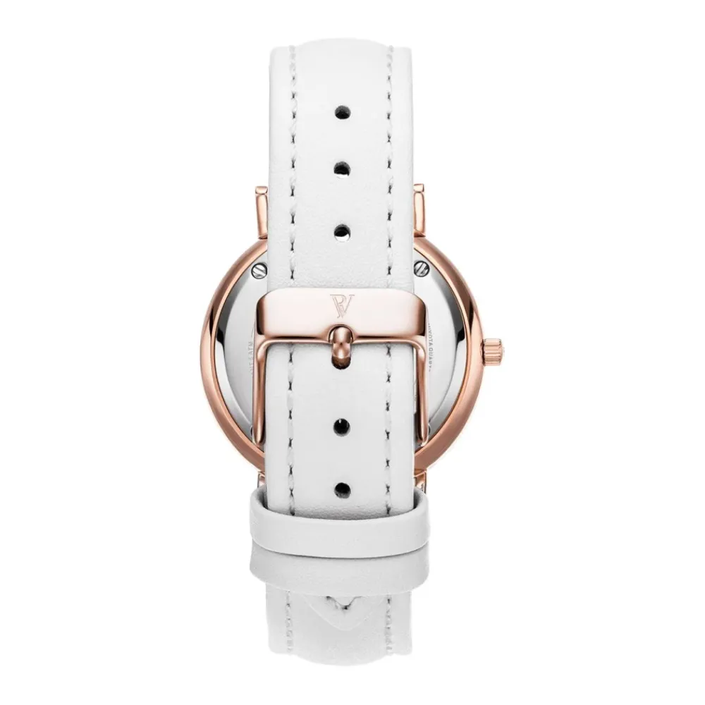De Paul Valentine PV36616 is een 36 mm horloge van Paul Valentine dat een roze wijzerplaat combineert met een roségouden roestvrijstalen kast. Het is ontworpen als een veelzijdig alledaags accessoire met een verfijnde, vrouwelijke uitstraling. Belangrijkste kenmerken: Roségoud | Roze | Wit | Roestvrij staal | Quartz uurwerk | Mineraalglas | Waterbestendig tot 5 bar | Pin-gesp sluiting | Verstelbare leren band | Roségouden kast | Roze wijzerplaat | Witte leren band | Afmetingen & pasvorm: Kastbreedte: 36 mm | Verstelbare leren band | Samenstelling & onderhoud: Roestvrij staal | Leer | Mineraalglas | Veeg de leren band af met een zachte, vochtige doek. Vermijd langdurige blootstelling aan water en contact met chemicaliën. Droog bewaren wanneer niet in gebruik.