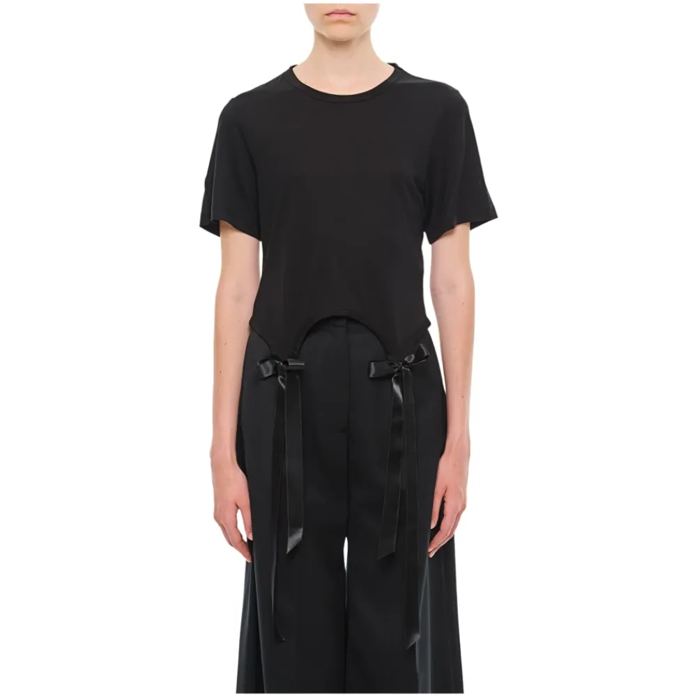 Simone Rocha T-shirt met korte mouwen, een ronde halslijn en een satijnen strik aan de voorkant, een verfijnde versie van een alledaagse top. Belangrijkste kenmerken: Zwart | Ronde halslijn | Korte mouwen | Satijnen strik aan de voorkant