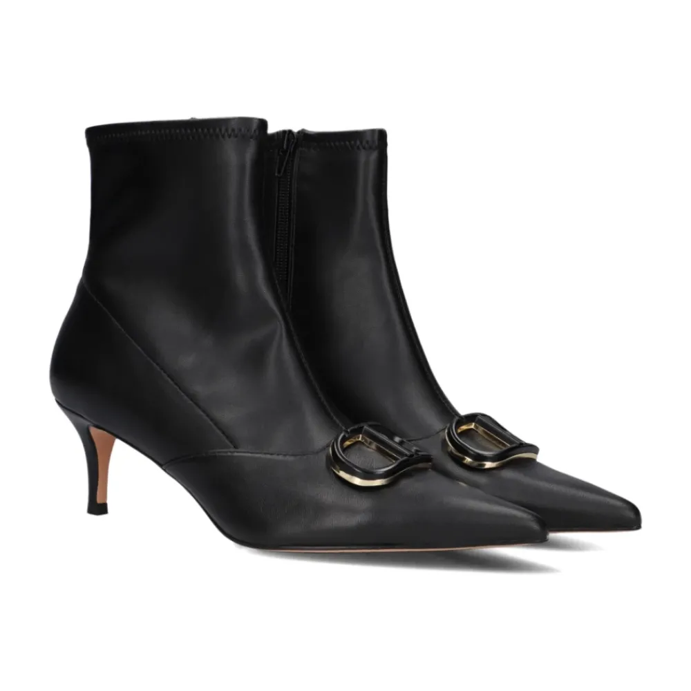 Stap stijlvol de herfst en winter in met de elegante enkellaarsjes 252TCP034 van TWINSET MILANO. Deze zwarte laarsjes met puntige neus en naaldhak geven elke outfit een verfijnde touch. De binnenkant is een combinatie van leer en leatherlook, wat zorgt voor comfort en een luxe uitstraling. De rubberen zool biedt grip tijdens een wandeling door het park of een avondje uit. De rits maakt het aan- en uittrekken eenvoudig. Combineer ze met een warme wollen jurk of een stijlvolle trenchcoat voor een complete look. Met een schachthoogte van 15 cm zijn ze perfect voor de modebewuste dames.