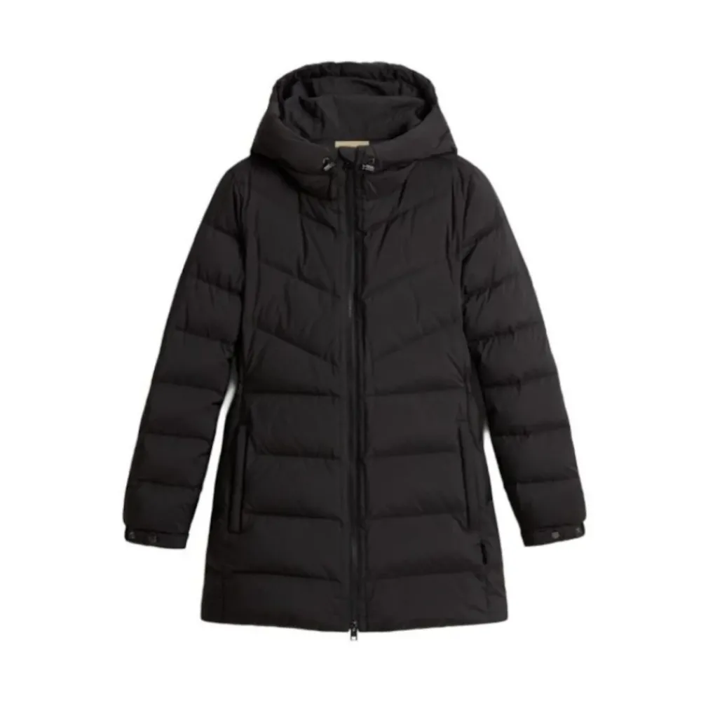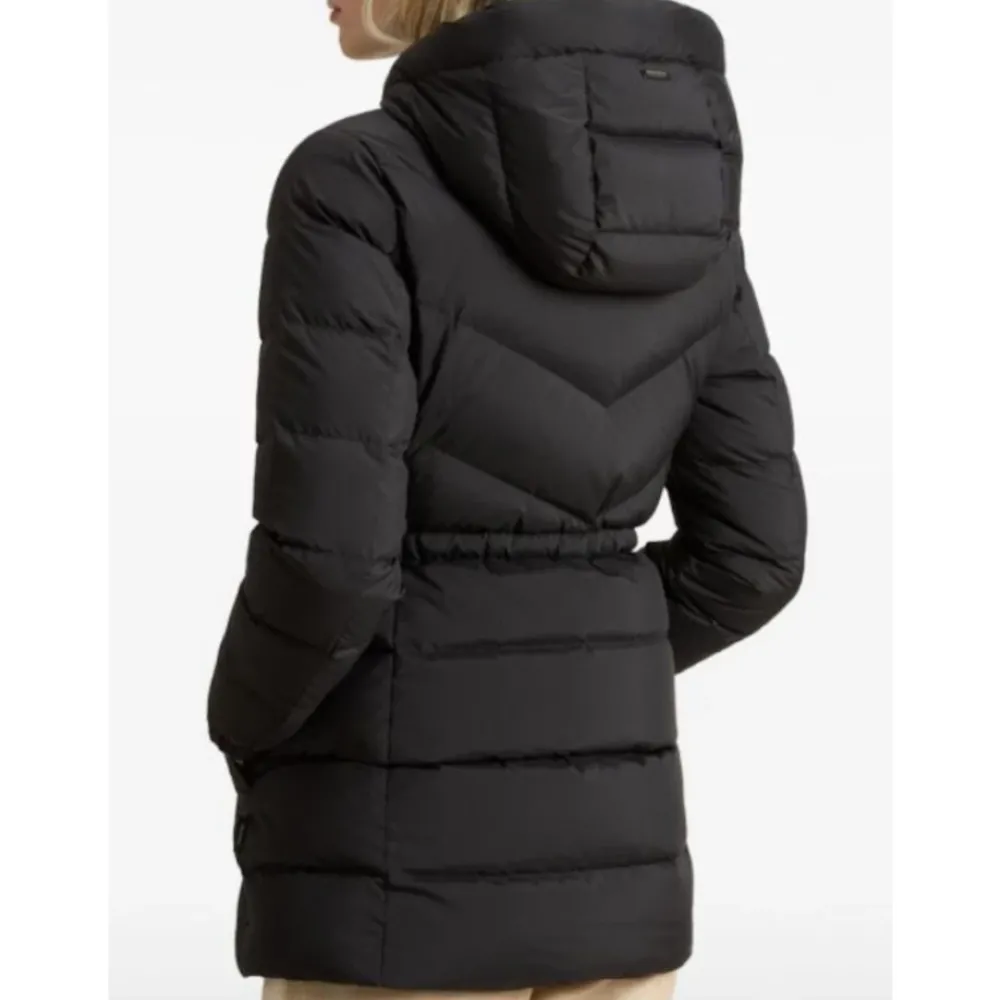 Blijf warm en stijlvol deze winter met deze zwarte donsjas van Woolrich. Met een doorgestikt ontwerp, aantrekkoord in de capuchon, ritssluiting, twee zijzakken en een logolabel op de achterkant van de capuchon, biedt deze jas een reguliere pasvorm voor een comfortabel gevoel.