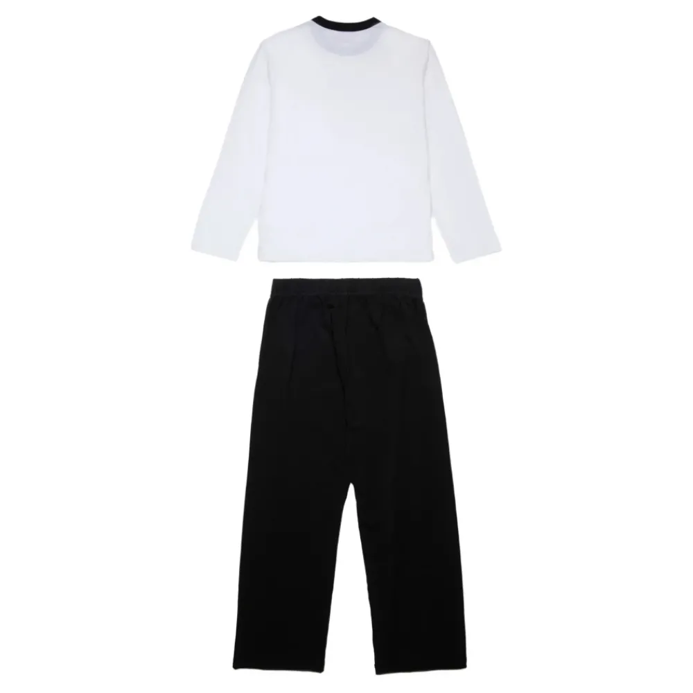 Kleed je kleine man in stijl met deze Diesel zwarte pyjamaset. De set bestaat uit een wit langärmelig t-shirt met een zwarte geribbelde ronde hals en bijpassende broek met een elastische taille. Met een opvallende rode logoprint op de voorkant is deze set zowel comfortabel als modieus. Gemaakt van 95% katoen en 5% elastaan, is het gemakkelijk te onderhouden met een machinewas op 30°C.